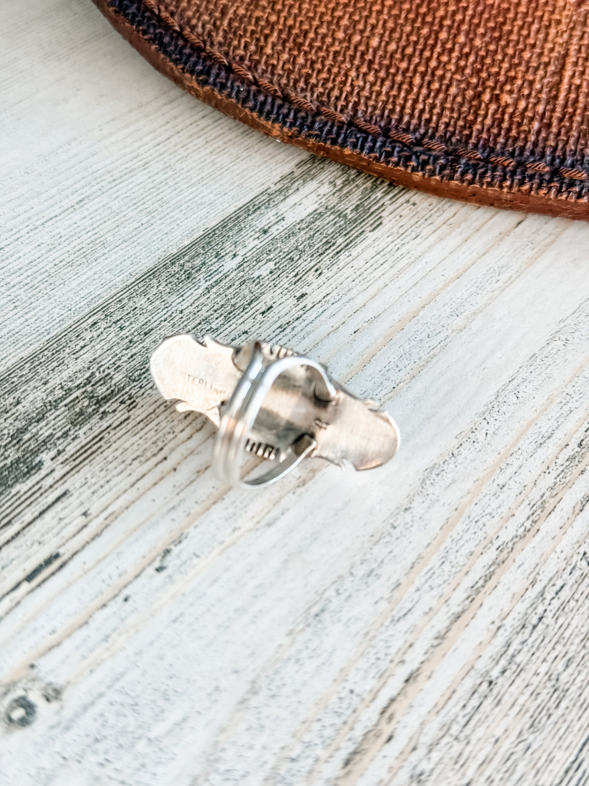 This ring features a long #8 Turquoise cabochon set in a polished sterling silver bezel. The elongated shape enhances the stone’s natural beauty, while the traditional silverwork adds classic Navajo elegance. Signed by Steve Francisco, this piece is both a wearable treasure and a collectible item.