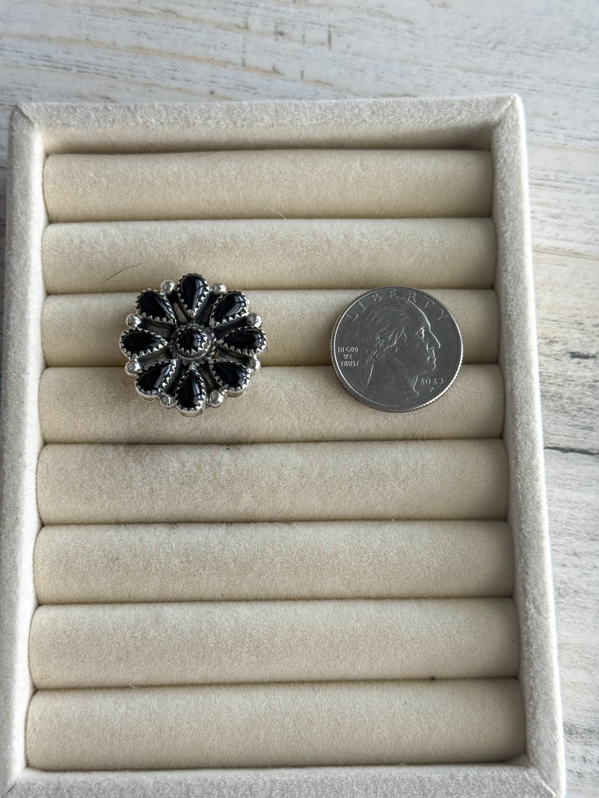 Elevate your jewelry collection with this striking Black Onyx Cluster Adjustable Ring, handcrafted by Navajo artist Nikki Yazzie. Known for her refined silversmithing, Nikki brings bold elegance to this traditional cluster design.