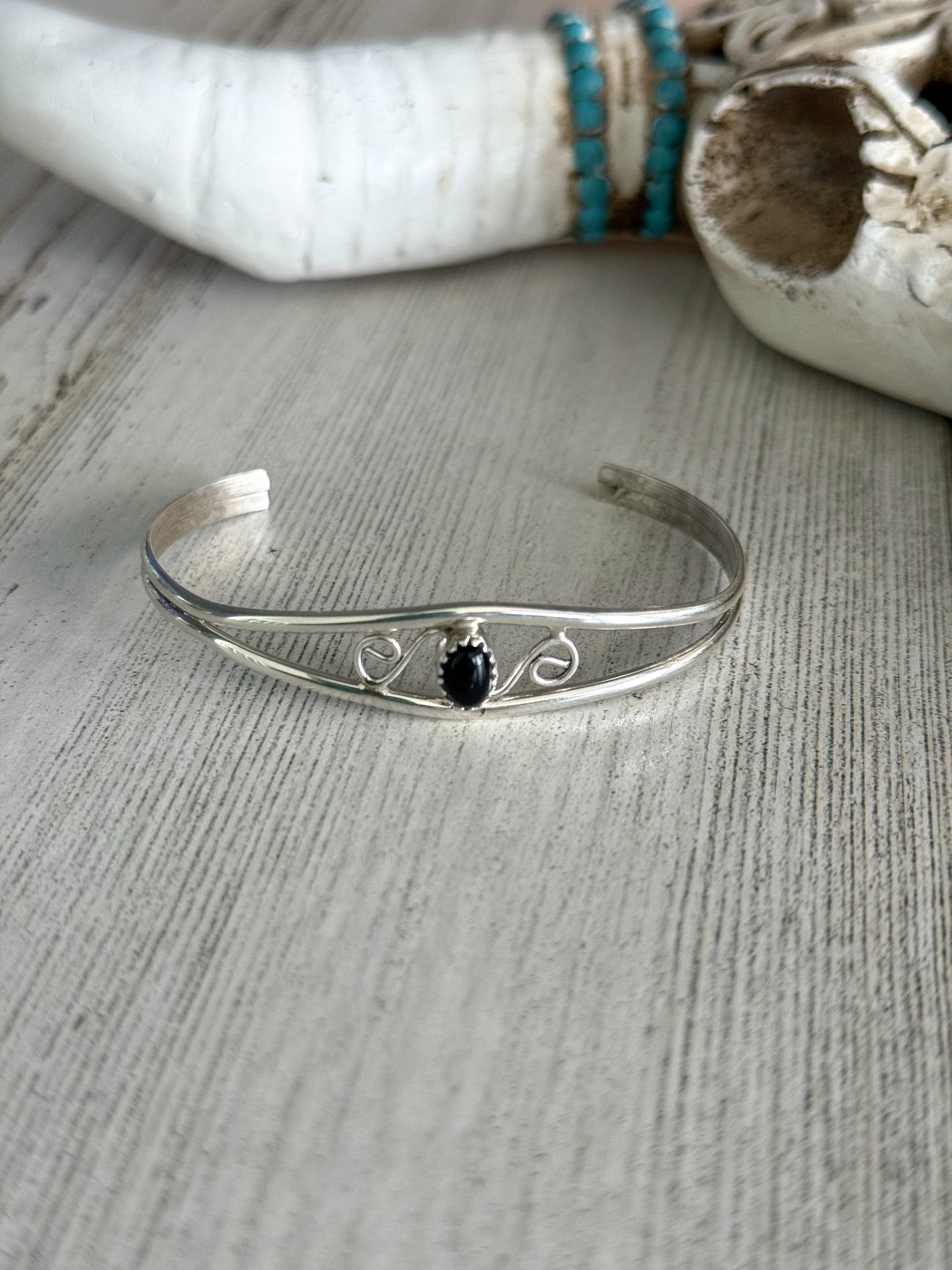 This handcrafted sterling silver cuff bracelet by Navajo artist Judy Lincoln features a striking black onyx centerpiece, showcasing the elegance and depth of this natural stone. Expertly designed, the cuff reflects traditional Navajo artistry with a bold and timeless style.