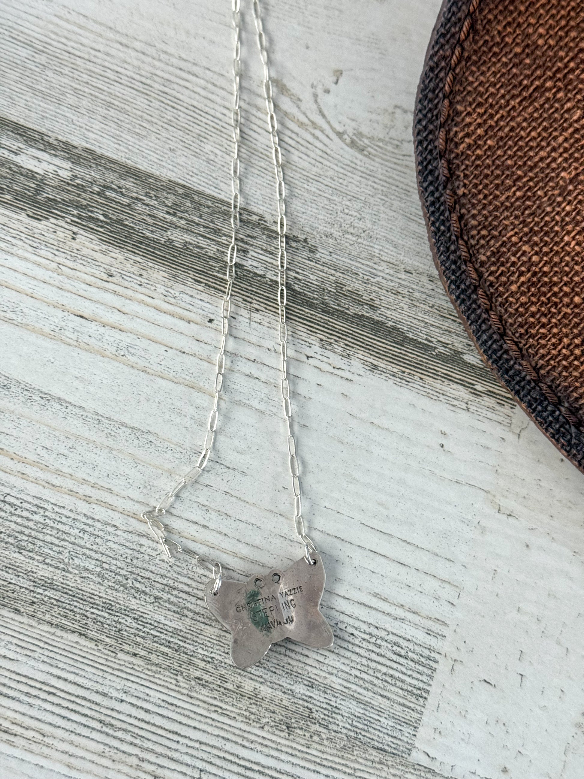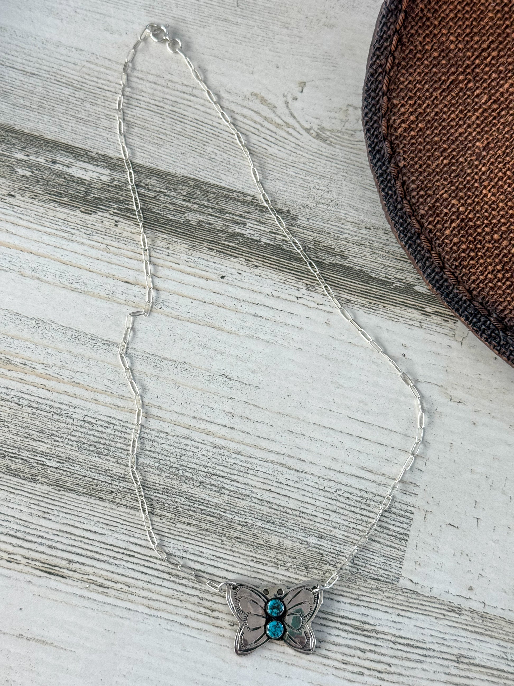 Handcrafted by Navajo artist Christina Yazzie, this charming butterfly pendant necklace combines sterling silver artistry with 2 vibrant Turquoise stones at its center. The butterfly symbolizes transformation, beauty, and freedom, making this piece both meaningful and wearable.