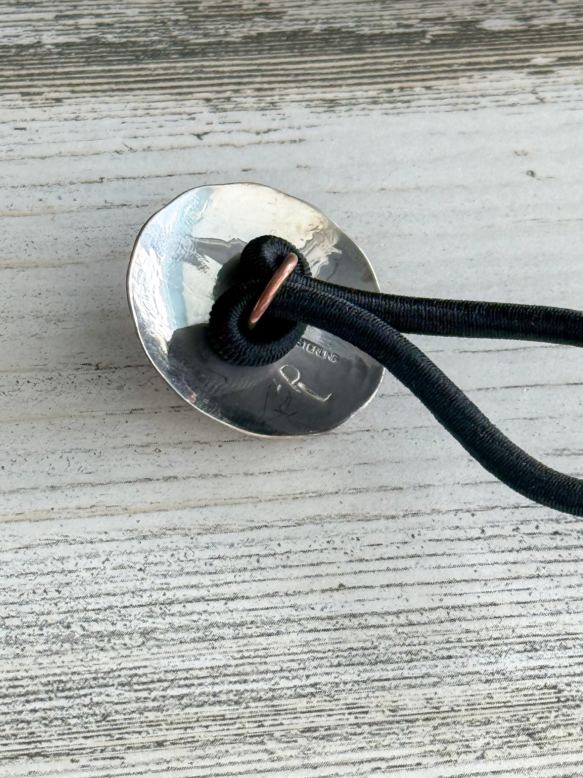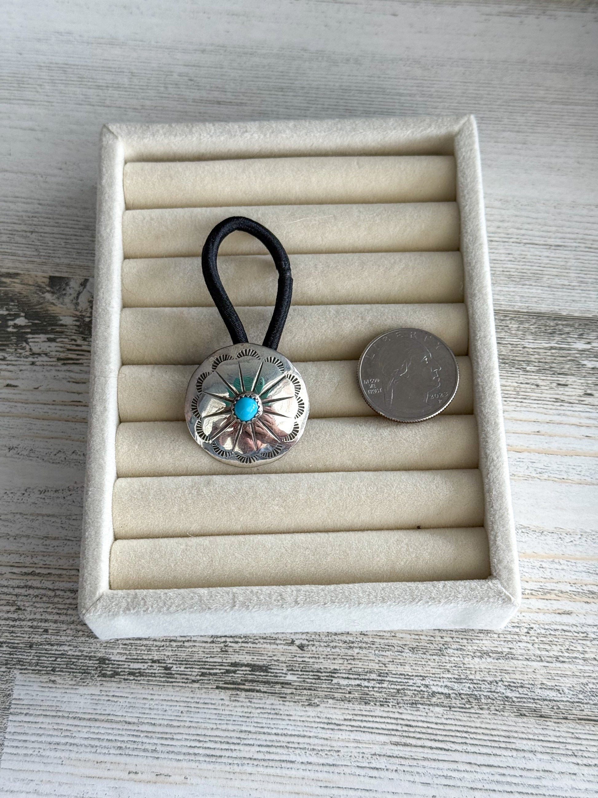 This stylish Concho Hair Tie is handcrafted by Navajo artist Phil Lynn, blending traditional Southwestern silverwork with everyday functionality. Each piece features a sterling silver concho with a dot of turquoise in the center, mounted on a stretch hair tie for easy wear.