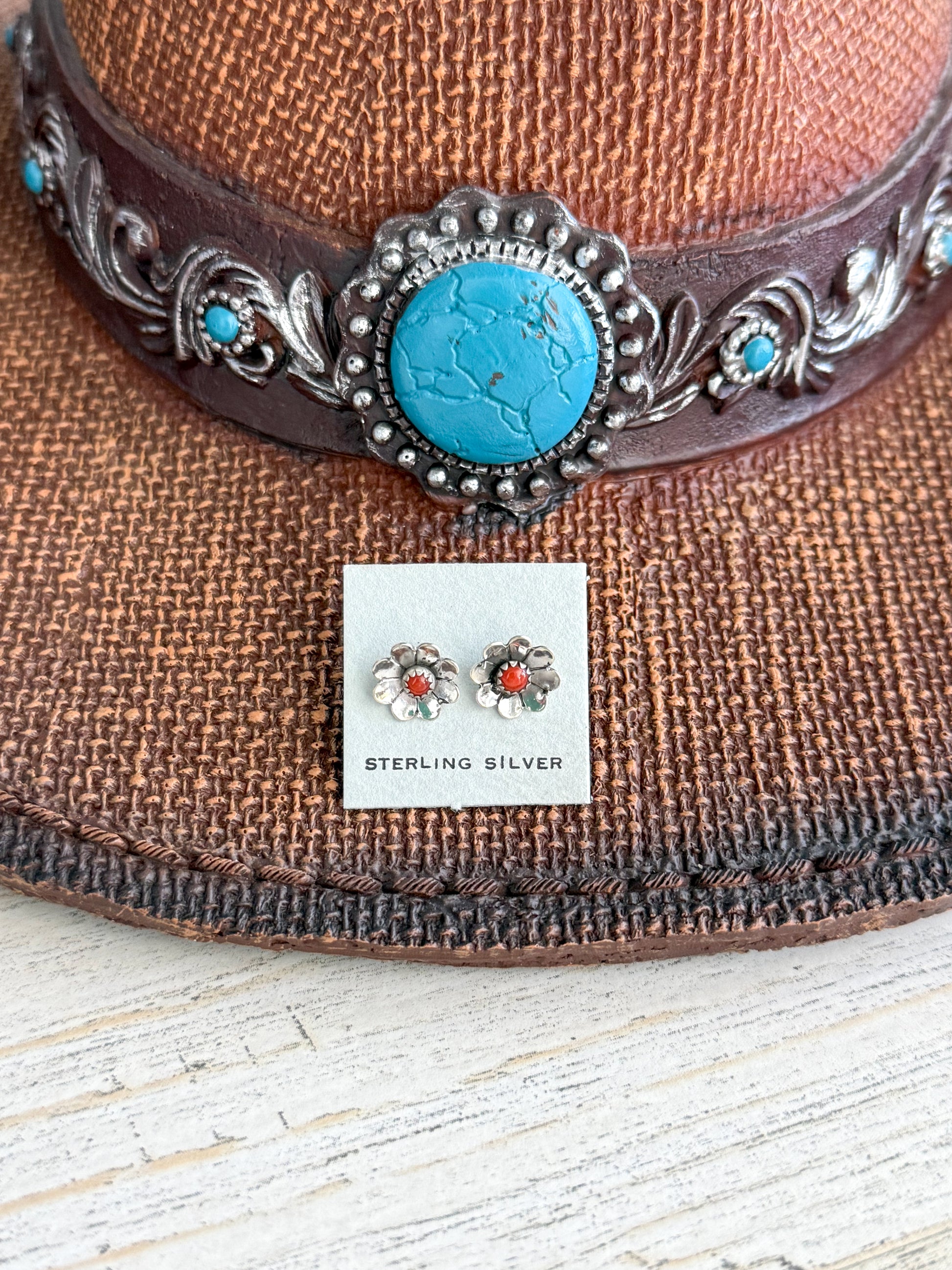 These charming Native American flower stud earrings are handcrafted by Navajo artist Adrian Yazzie. Made from sterling silver, each earring features a delicate flower design accented with a dot of coral at the center, adding a subtle pop of color.