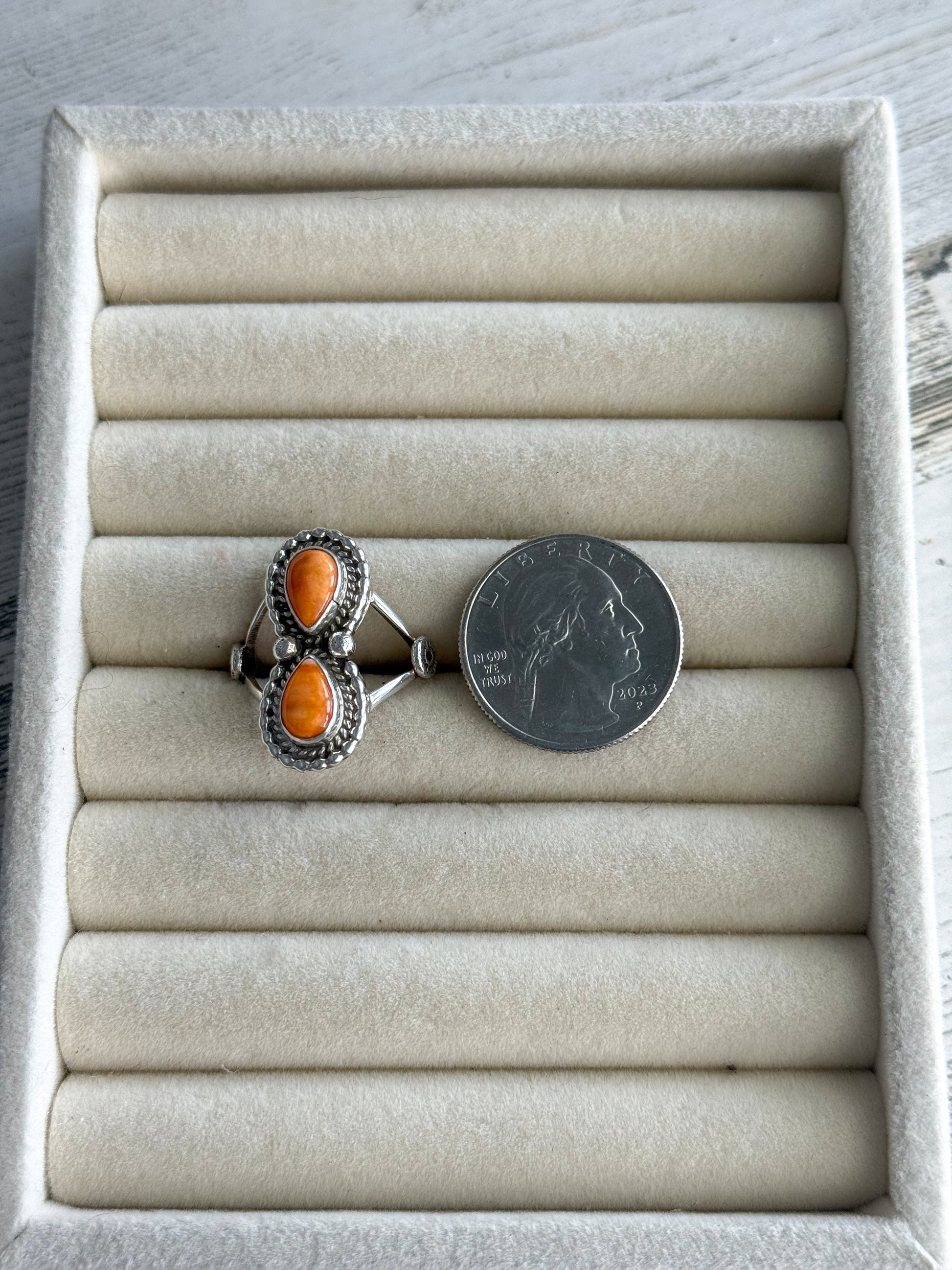 Add a bold touch of Southwestern elegance to your jewelry collection with this stunning two-stone Orange Spiny Oyster ring handcrafted by Navajo artist Lucinda Linkin. The vibrant orange spiny stones bring warmth and character, each displaying natural color variations that make every piece unique. The stones are beautifully accented with intricate silver detailing, showcasing the skilled artistry that Navajo jewelry is known for. This size 8 ring is signed by the artist, ensuring authenticity and lasting collectible value.