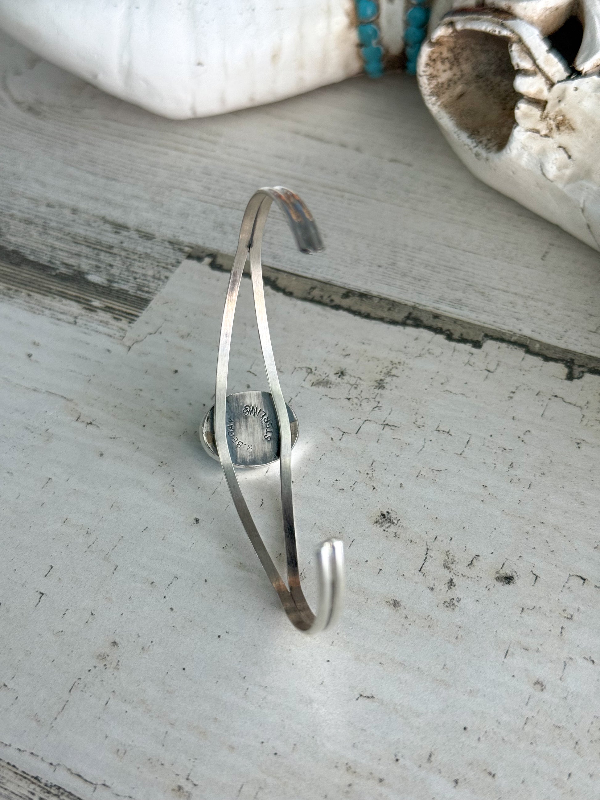 Featuring a vibrant piece of genuine Egyptian Turquoise set in sterling silver, this cuff blends timeless elegance with cultural artistry. The stone’s deep blue-green hue contrasts beautifully with the hand-finished silverwork, showcasing Begay’s signature craftsmanship.