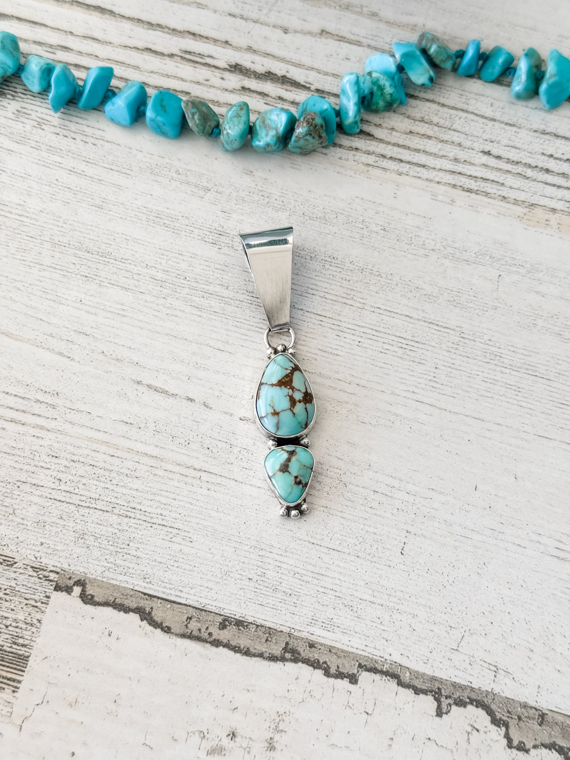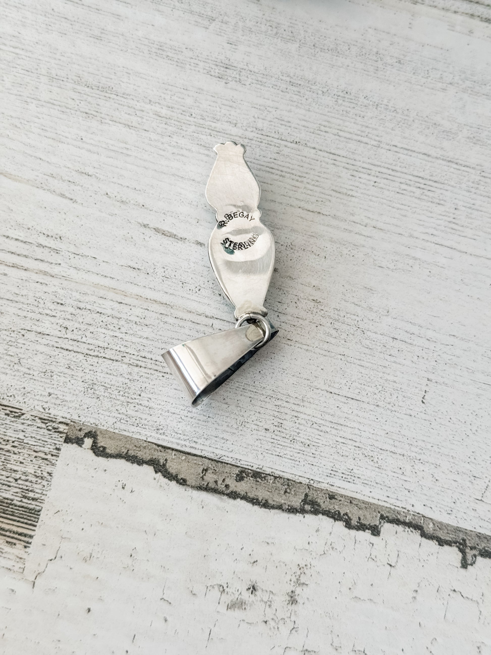 This handcrafted pendant by Navajo artist Rena Begay features a beautiful Egyptian turquoise stone set in sterling silver. Its elegant design highlights the natural beauty of the stone, making it a timeless addition to any jewelry collection.