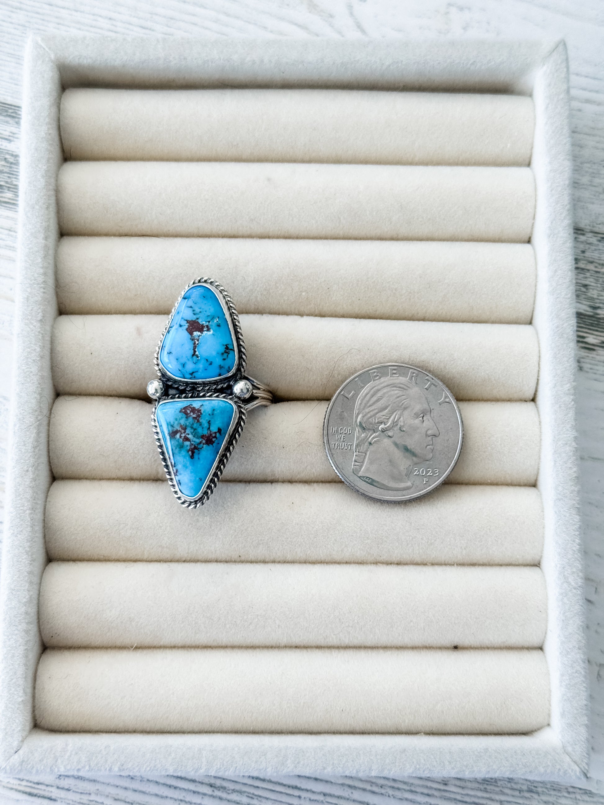This stunning ring by Navajo artist Eugene Gruber features two vibrant Egyptian turquoise stones set in sterling silver. Expertly handcrafted, this piece combines traditional Navajo artistry with the bold beauty of natural turquoise.