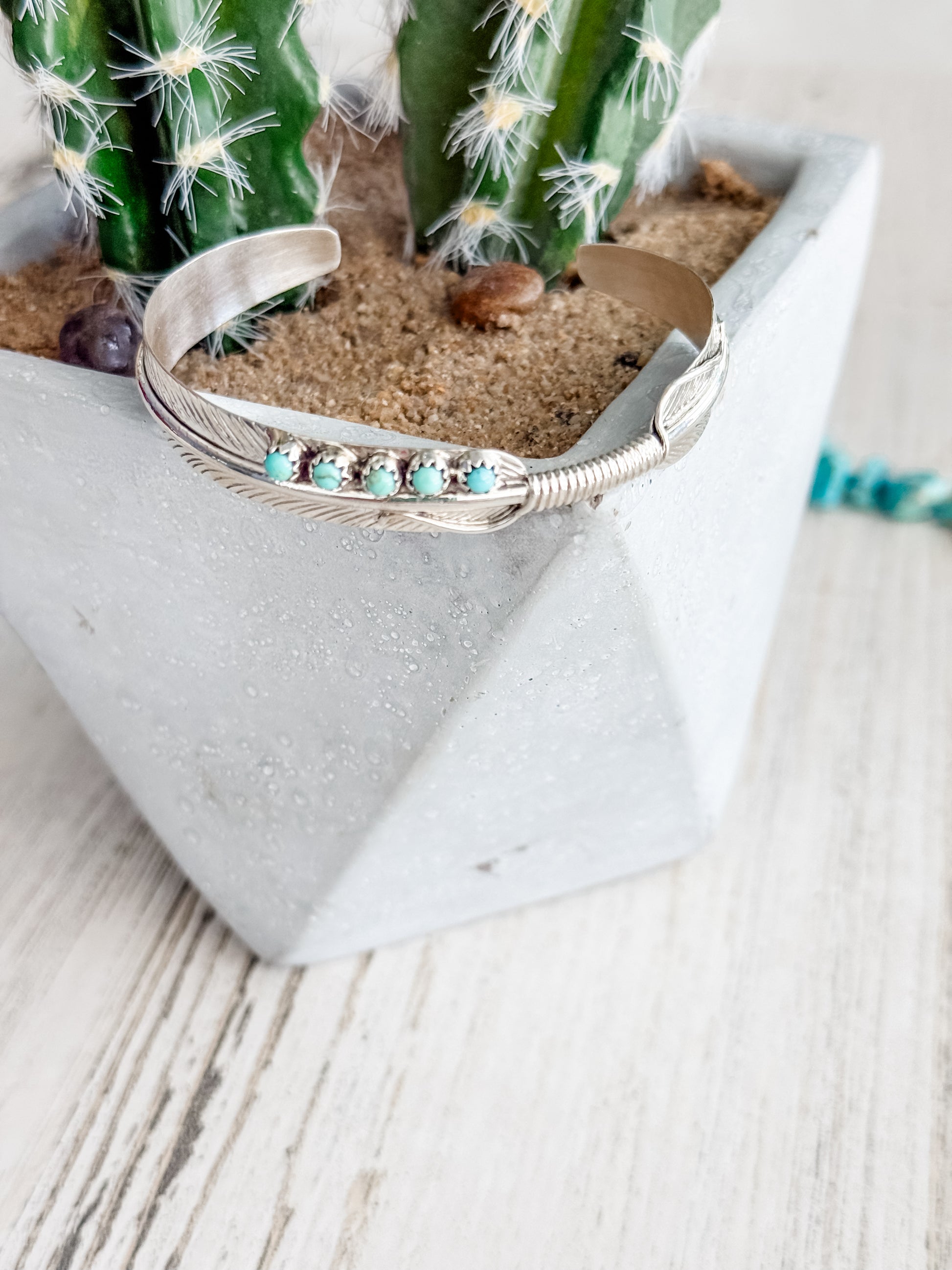 Showcase authentic Navajo craftsmanship with this Sterling Feather Wrap Cuff by Aaron Davis. The cuff features intricate feather detailing and is accented with five small turquoise stones, combining traditional design with vibrant Southwestern color.