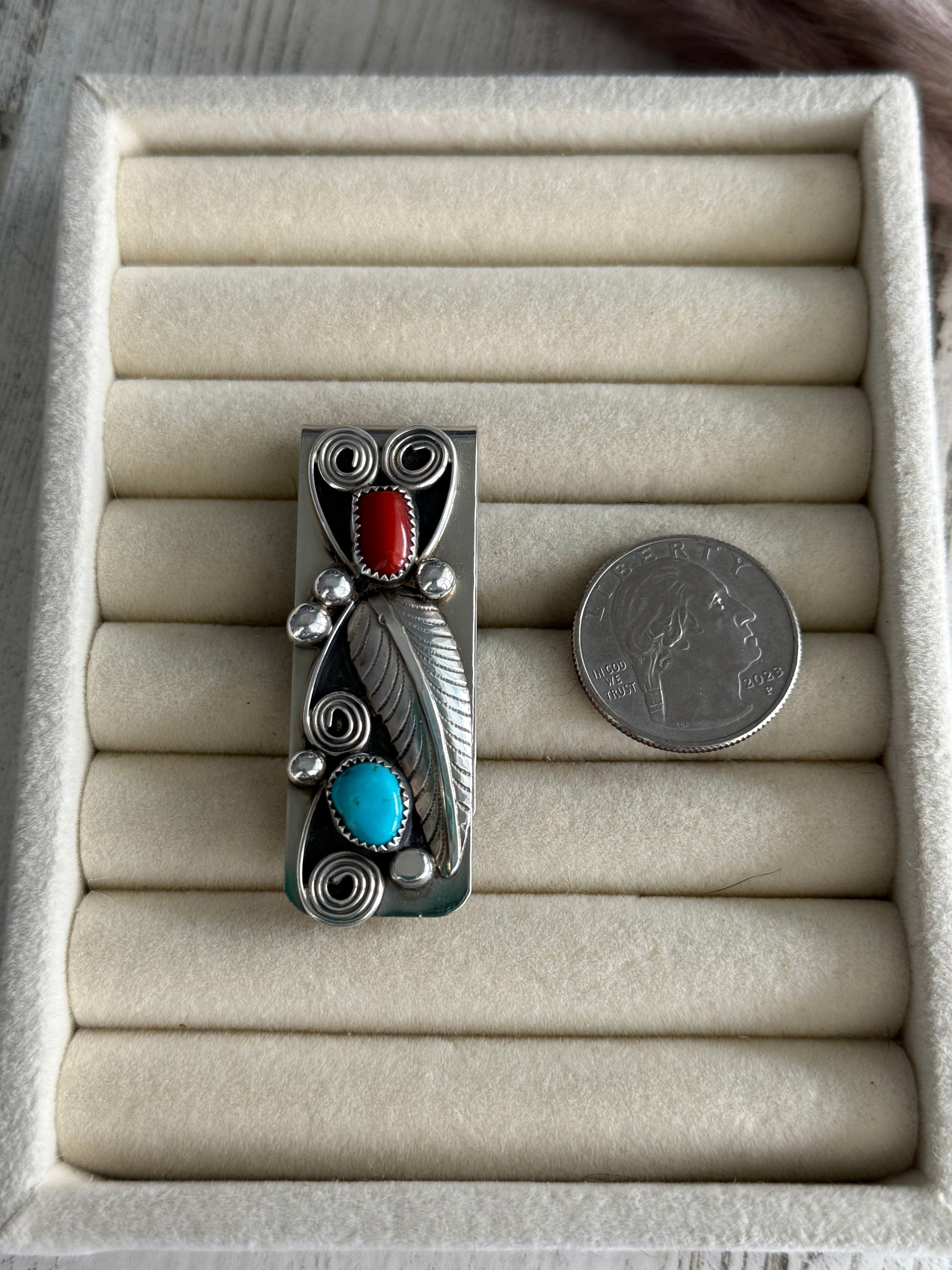 Handcrafted by Navajo artists Wilbur and Elise Myers, this elegant sterling silver leaf money clip beautifully showcases Kingman turquoise and vivid coral, expertly set to highlight the natural beauty of each stone. The detailed leaf design reflects traditional Native American artistry, combining functionality with timeless Southwestern style.
