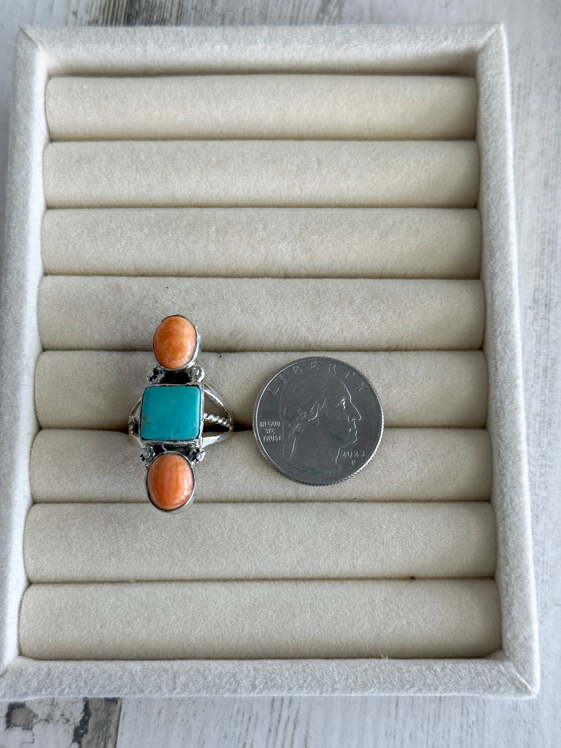 The ring showcases a central Kingman turquoise stone, known for its rich blue hue, flanked by two orange spiny oyster stones, creating a stunning contrast of colors. Handcrafted in sterling silver, this ring is polished to highlight the natural beauty of the stones while reflecting traditional Navajo design.