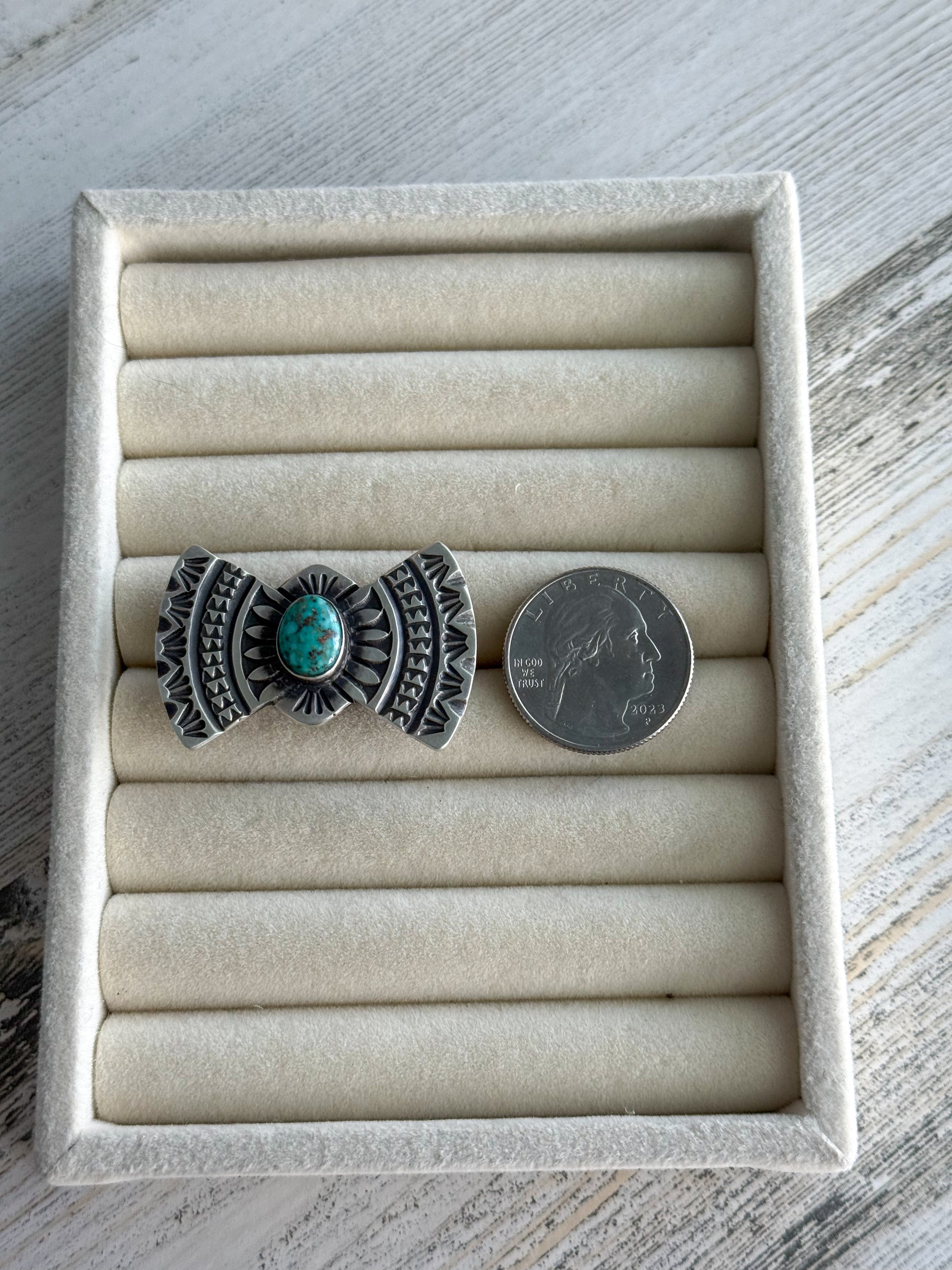 The ring highlights a brilliant Kingman turquoise stone set at the center of carefully stamped sterling silver, creating a unique and visually striking design. Each detail is handcrafted, reflecting the skill and tradition of Navajo silversmithing.