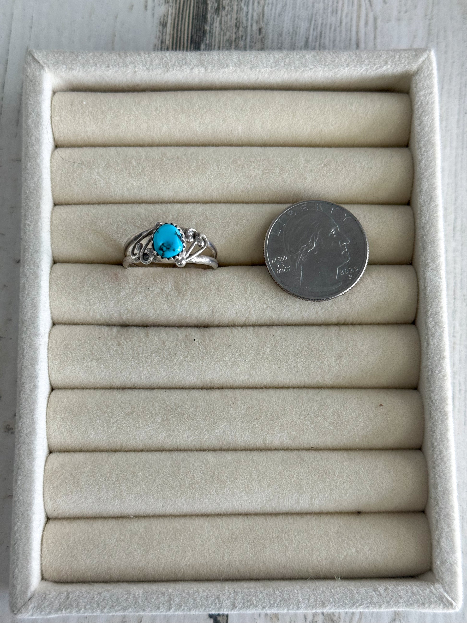 Featuring a single Kingman turquoise stone set in sterling silver, this ring highlights the natural beauty and vibrant color of the stone with a simple, classic design. The ring’s clean lines make it versatile for everyday wear or as a subtle statement piece.