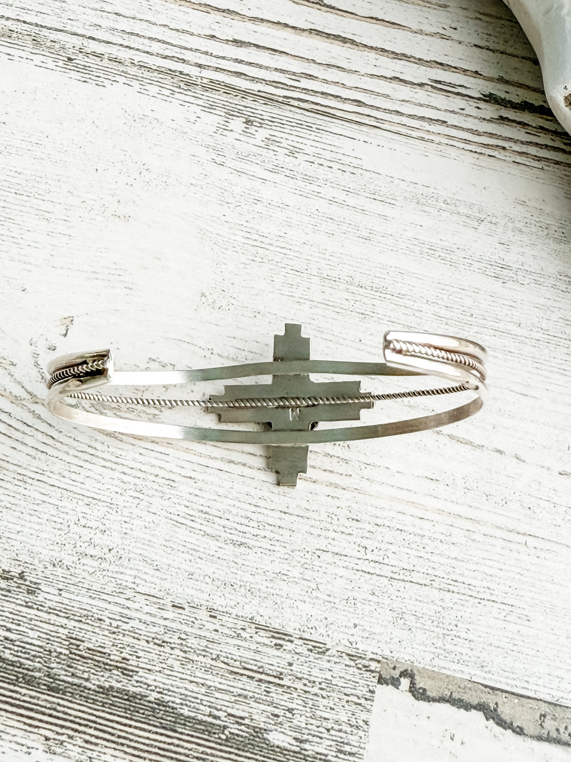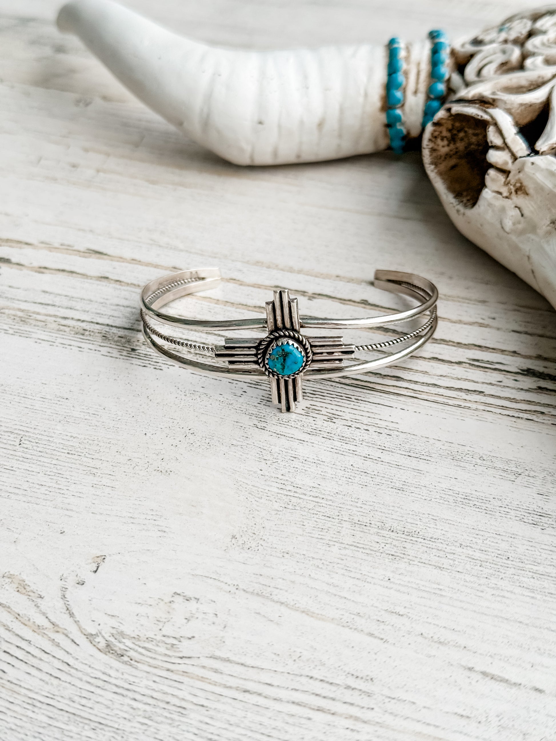 Celebrate authentic Navajo artistry with this Sterling Silver Cuff featuring a striking Kingman turquoise stone and the Zia sun symbol, handcrafted by Navajo artist David Morris. The Zia design, a sacred emblem representing the circle of life and harmony, is beautifully paired with vibrant Kingman turquoise, creating a bold statement piece that honors Southwestern tradition.
