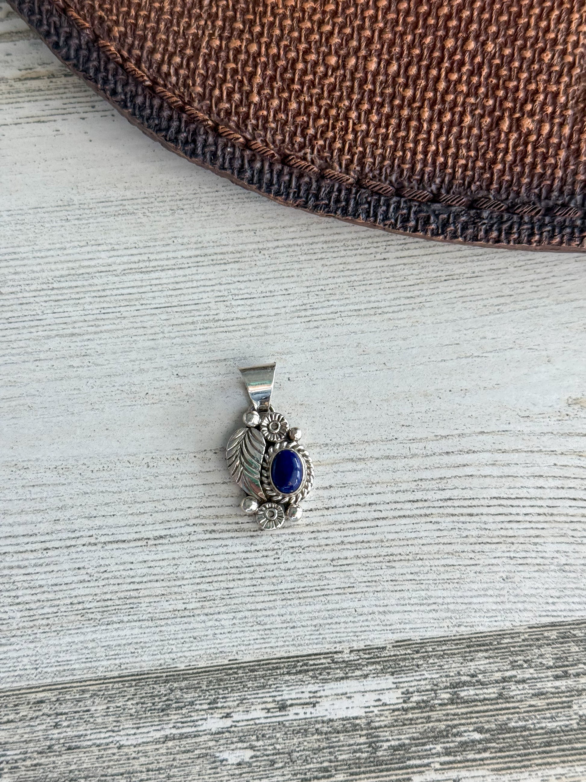 This elegant Lapis pendant is handcrafted by Navajo artist Ella Linkin, showcasing her refined silverwork and attention to detail. The smooth lapis stone serves as the centerpiece, accented by a delicate sterling silver leaf on the side, adding subtle texture and natural beauty.