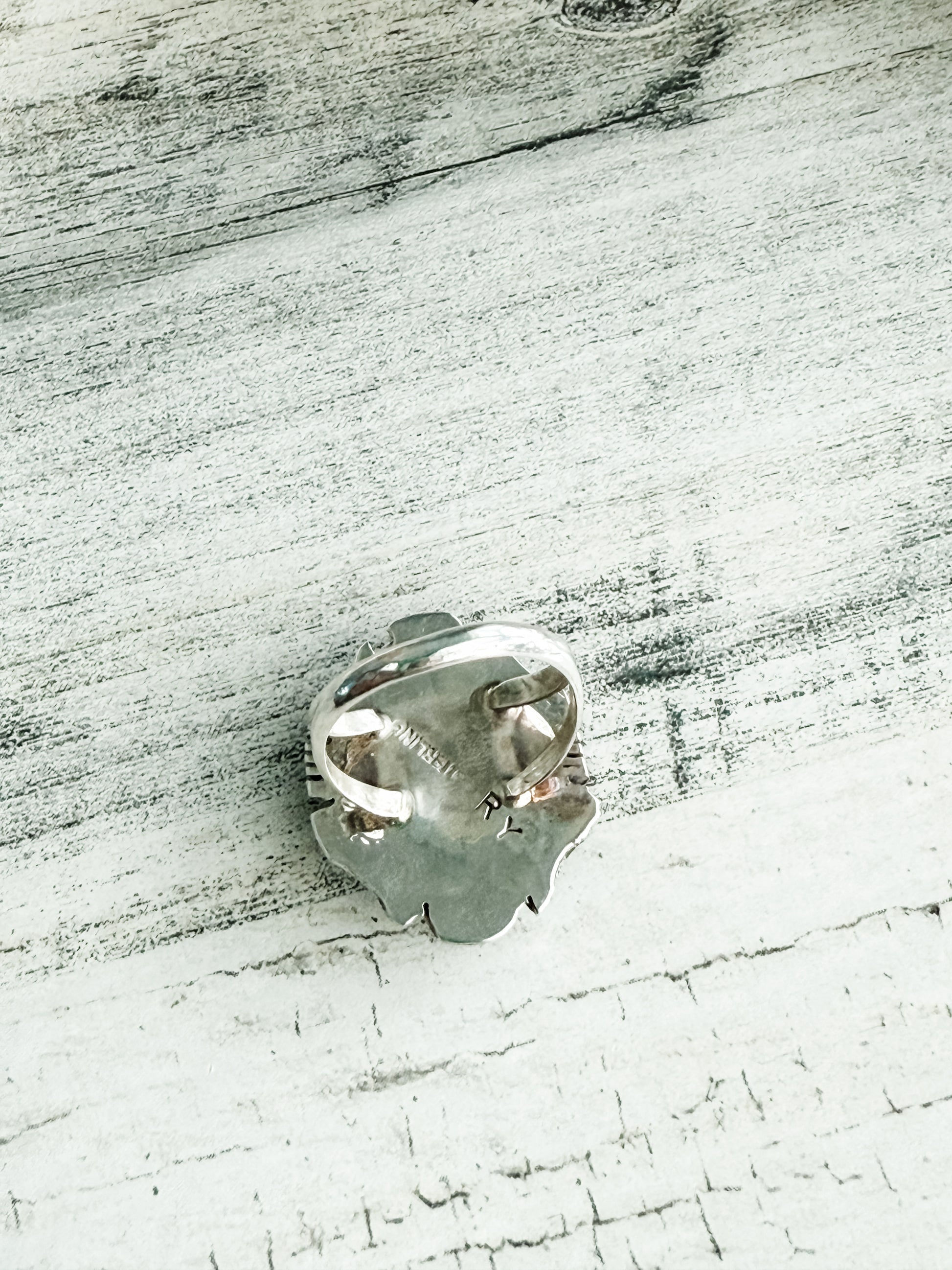 Handcrafted by Navajo artist Raymond Yazzie, this striking ring features genuine Kingman turquoise set in a classic sterling silver band. Its bold color and traditional design make it a standout piece for collectors and anyone who appreciates authentic Native jewelry.