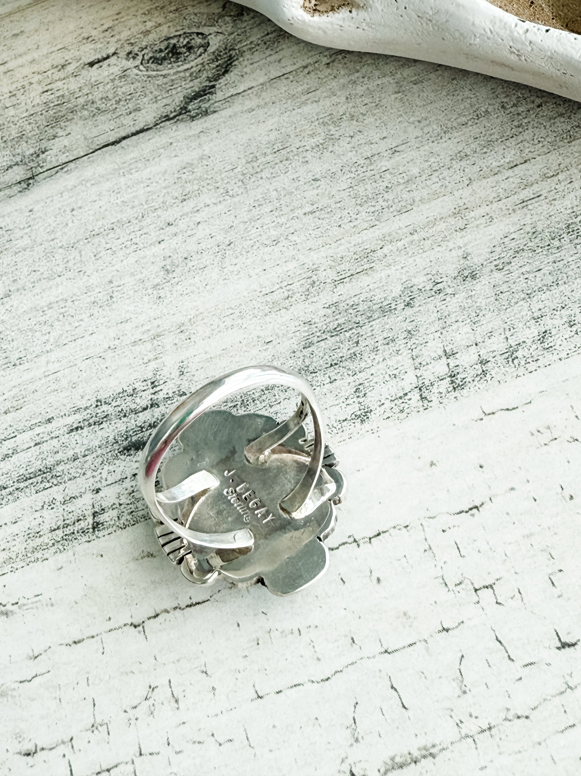 Handcrafted by Navajo artist Junior Begay, this stunning ring features a vibrant Kingman turquoise stone set in sterling silver with beautiful intricate silver detailing surrounding the stone. Its bold design and exceptional craftsmanship make it a standout piece for collectors and lovers of Native jewelry.