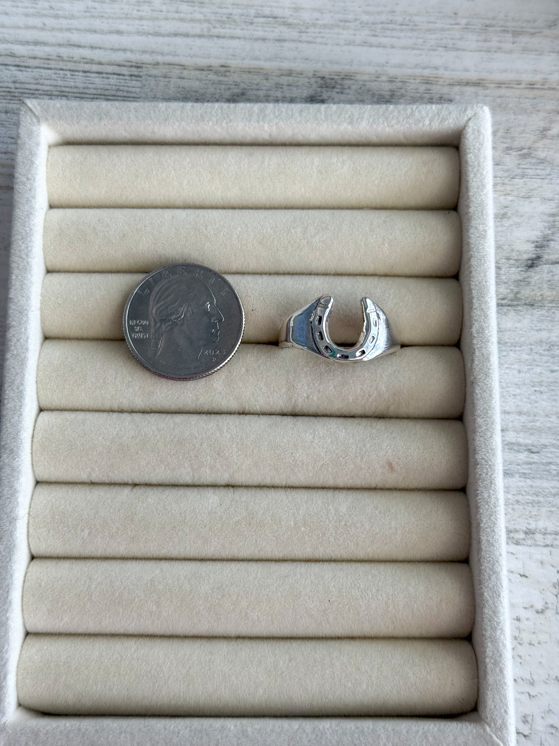 The ring features a bold horseshoe motif, symbolizing luck and protection, making it both a meaningful and stylish addition to any jewelry collection. Expertly crafted from high-quality sterling silver, this piece is durable enough for daily wear while retaining its elegant shine.