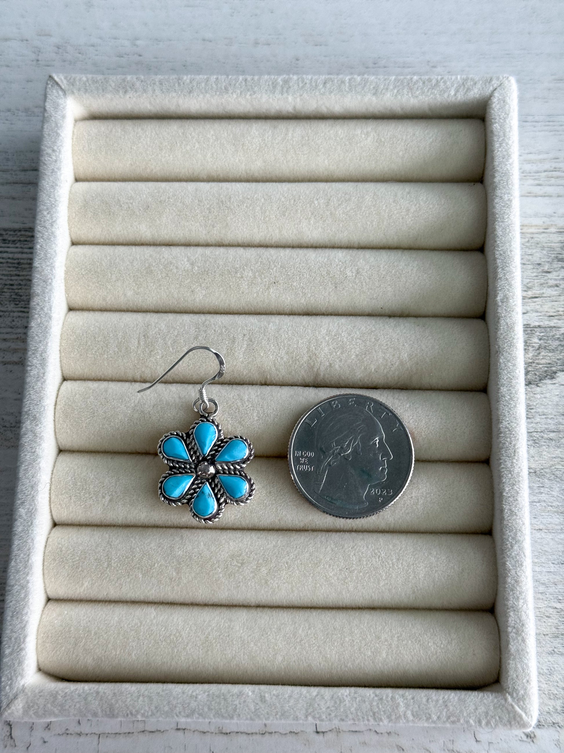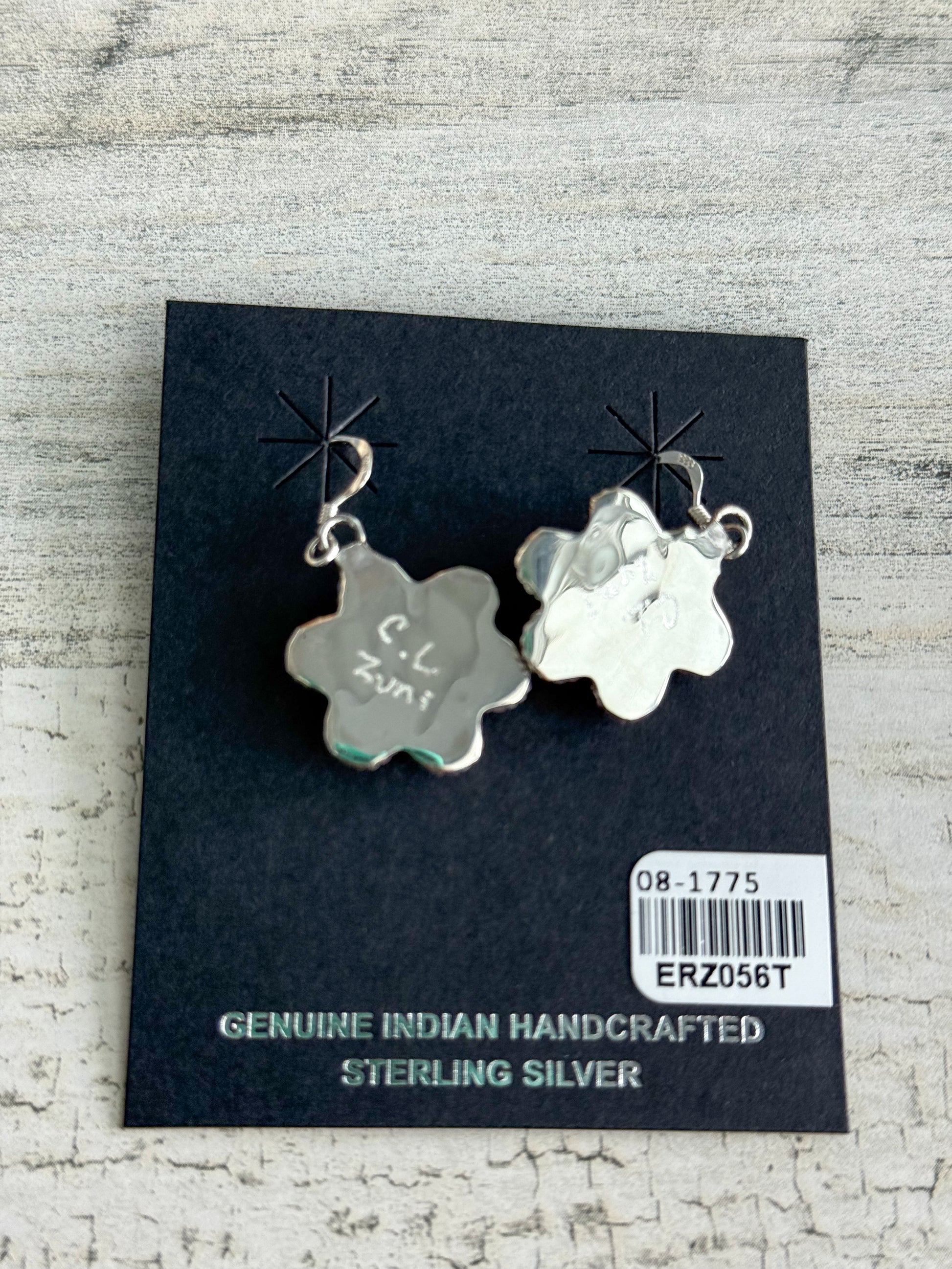 Delicately handcrafted by Zuni artist Carol Lateyice, these charming flower dangle earrings feature intricate turquoise inlay set in sterling silver. At 3/4" in diameter, they offer a subtle yet striking touch of Native artistry, perfect for everyday wear or special occasions.