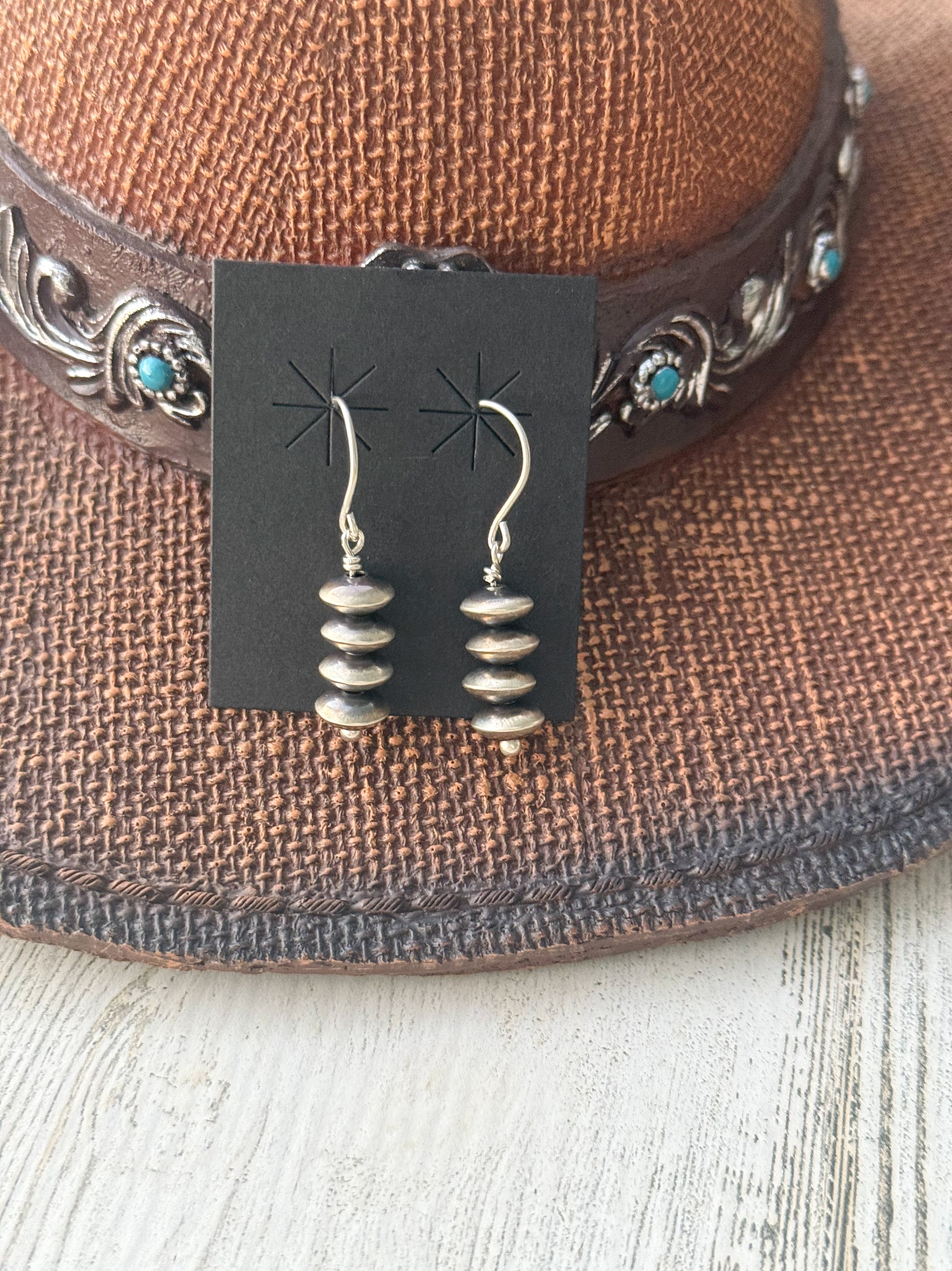 These handcrafted Navajo Pearl earrings were skillfully made by Navajo silversmith Bryannen Halwood, honoring the traditional Navajo silversmithing techniques passed down through generations. Each bead is individually hand-oxidized and polished to create the signature depth and satin glow of authentic Navajo Pearls.