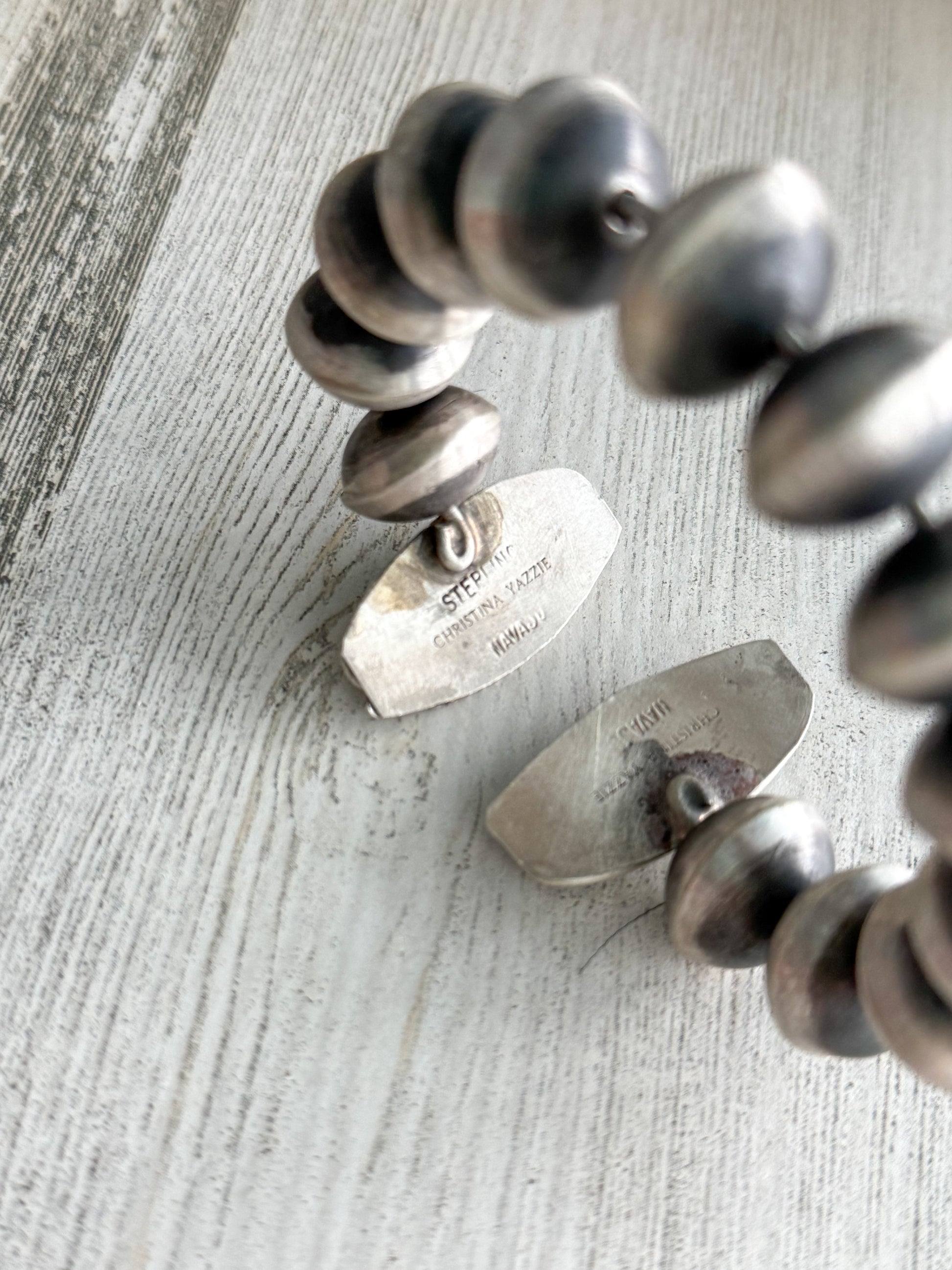 Handmade by Navajo artist Christina Yazzie, this stunning bracelet features classic Navajo pearls paired with the vibrant elegance of Royston Turquoise. Each silver bead is individually formed, oxidized, and polished by hand—giving the pearls their signature satin finish and traditional character. The two natural Royston Turquoise stones display beautiful, earthy matrix tones that complement the warm depth of the sterling silver.