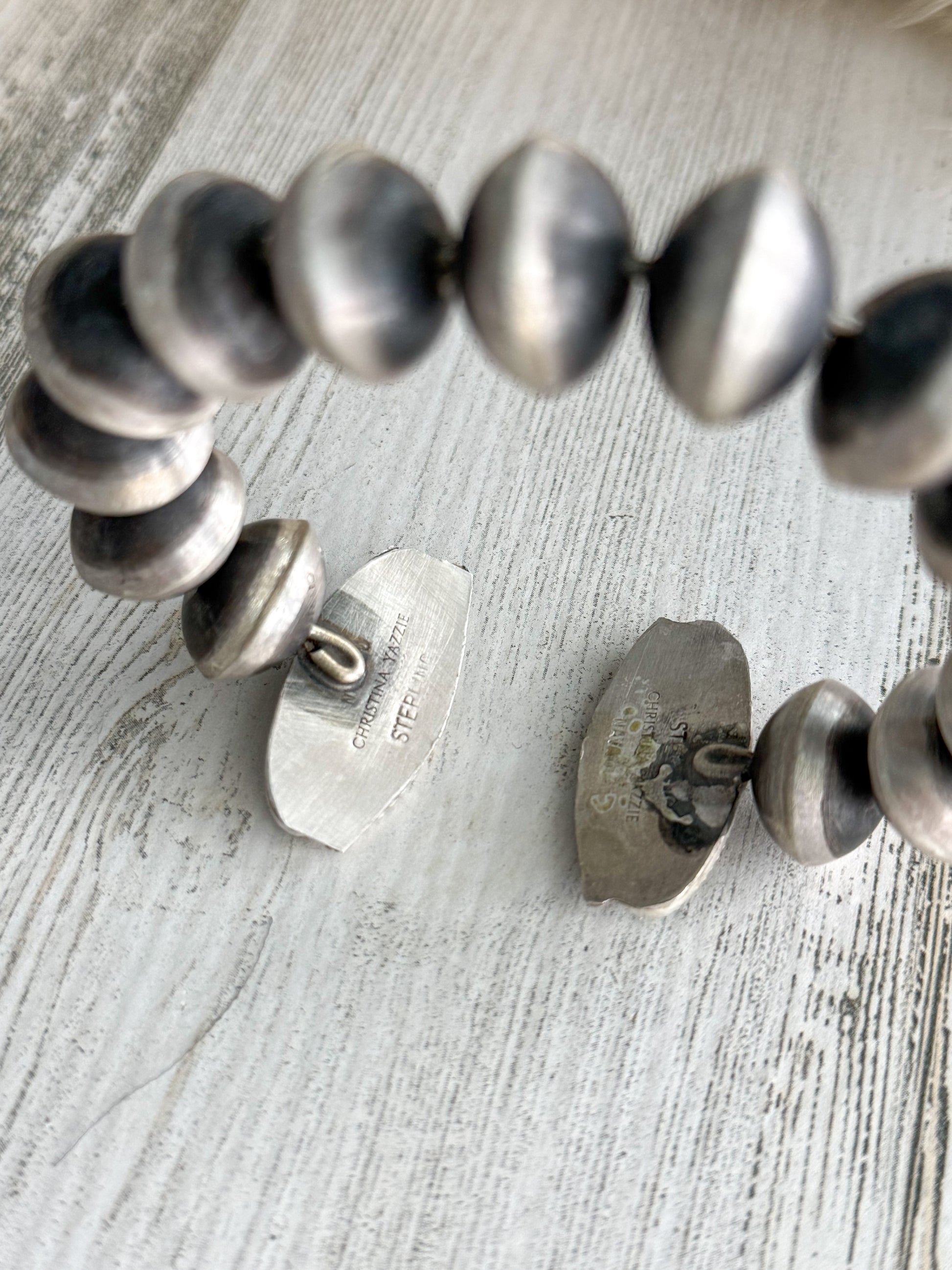 Handmade by Navajo artist Christina Yazzie, this stunning bracelet features classic Navajo pearls paired with the vibrant elegance of Royston Turquoise. Each silver bead is individually formed, oxidized, and polished by hand—giving the pearls their signature satin finish and traditional character. The two natural Royston Turquoise stones display beautiful, earthy matrix tones that complement the warm depth of the sterling silver.