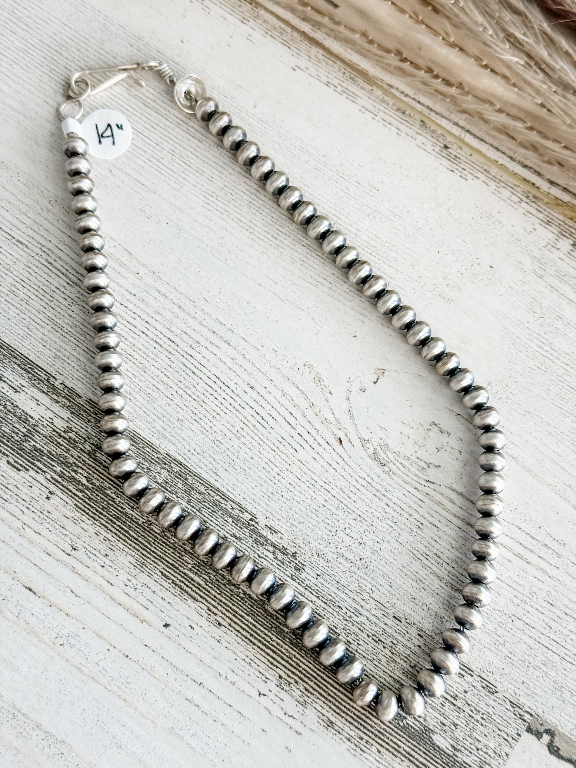 Showcase the timeless elegance of authentic Navajo pearls with this beautiful necklace by renowned Navajo artist Bryannen Halwood. Expertly crafted, this piece highlights the classic luster and sophistication of Navajo pearls, making it a versatile and stylish accessory.