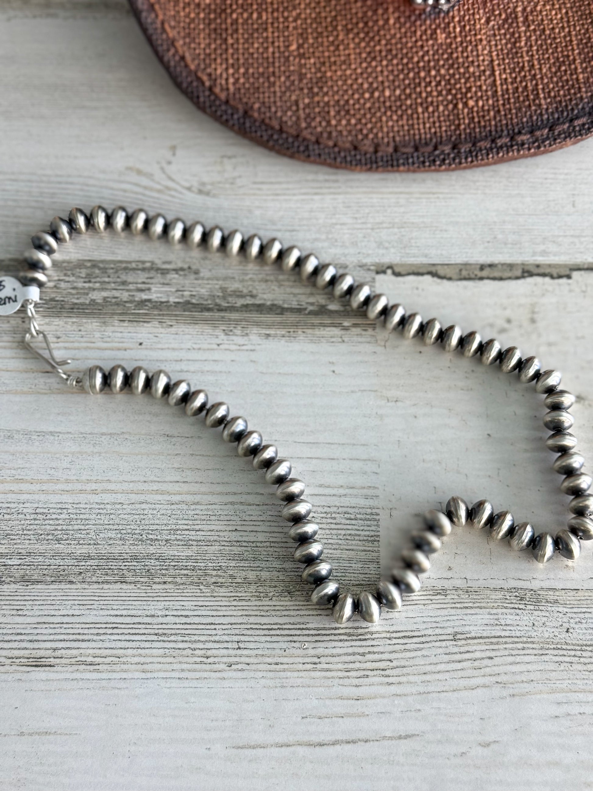 Showcase the timeless elegance of authentic Navajo pearls with this beautiful necklace by renowned Navajo artist Bryannen Halwood. Expertly crafted, this piece highlights the classic luster and sophistication of Navajo pearls, making it a versatile and stylish accessory.