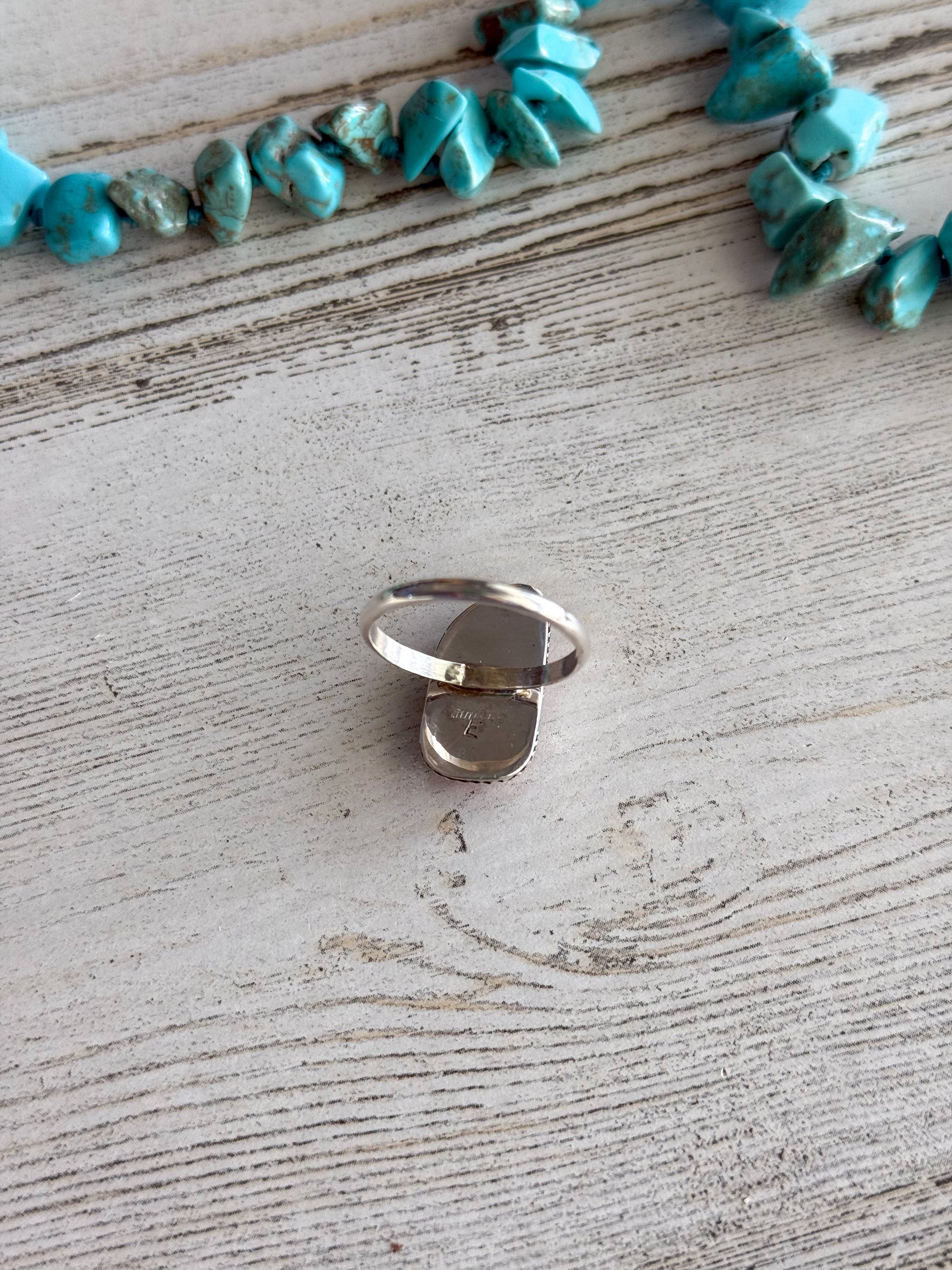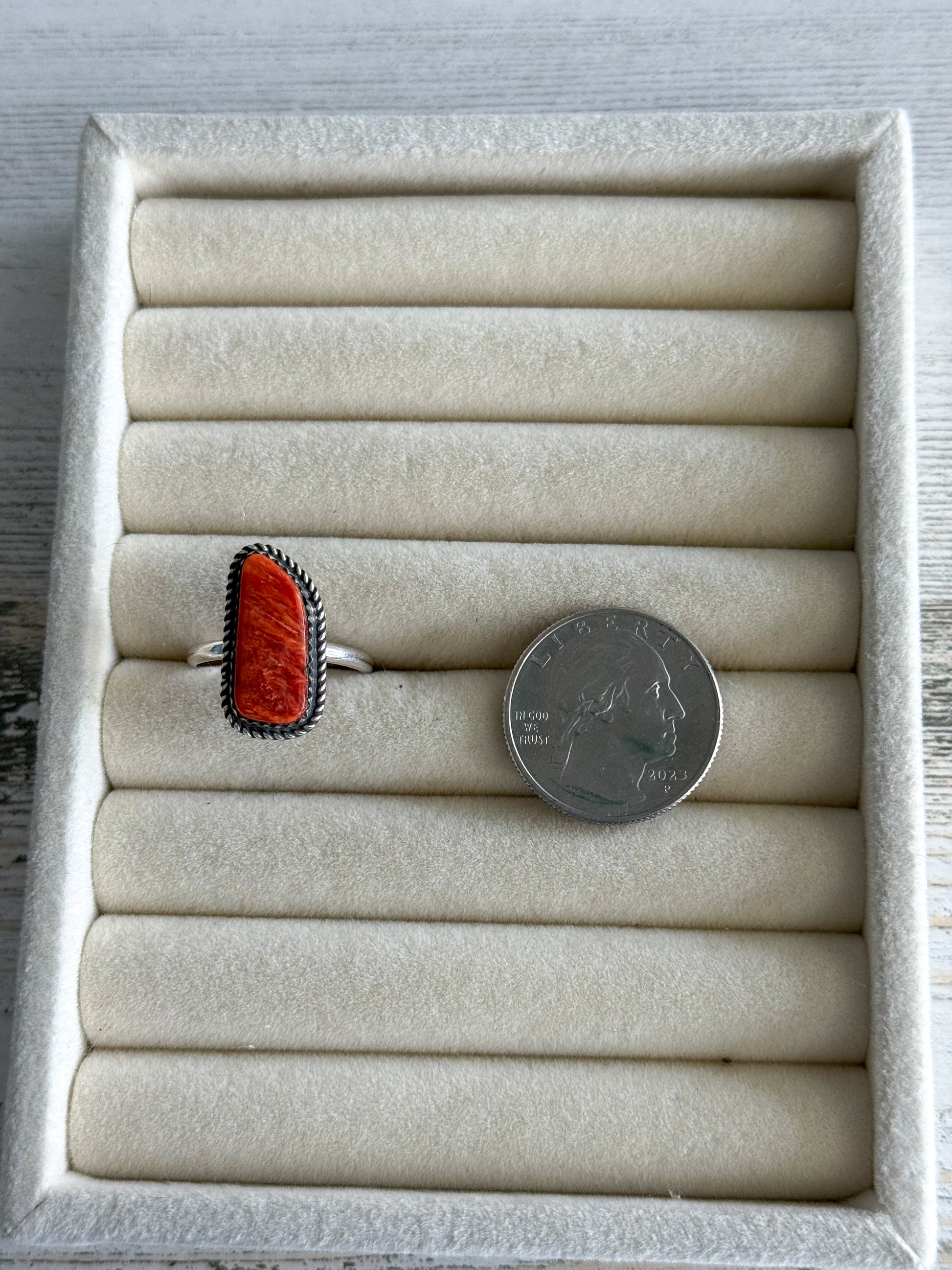 This vibrant Red Spiny ring is handcrafted by Navajo artist Kristin Ella Cowboy, featuring a striking red spiny oyster stone set in sterling silver. The bold, natural color of the stone creates a statement piece that highlights the traditional artistry and skilled craftsmanship of Navajo jewelry-making.
