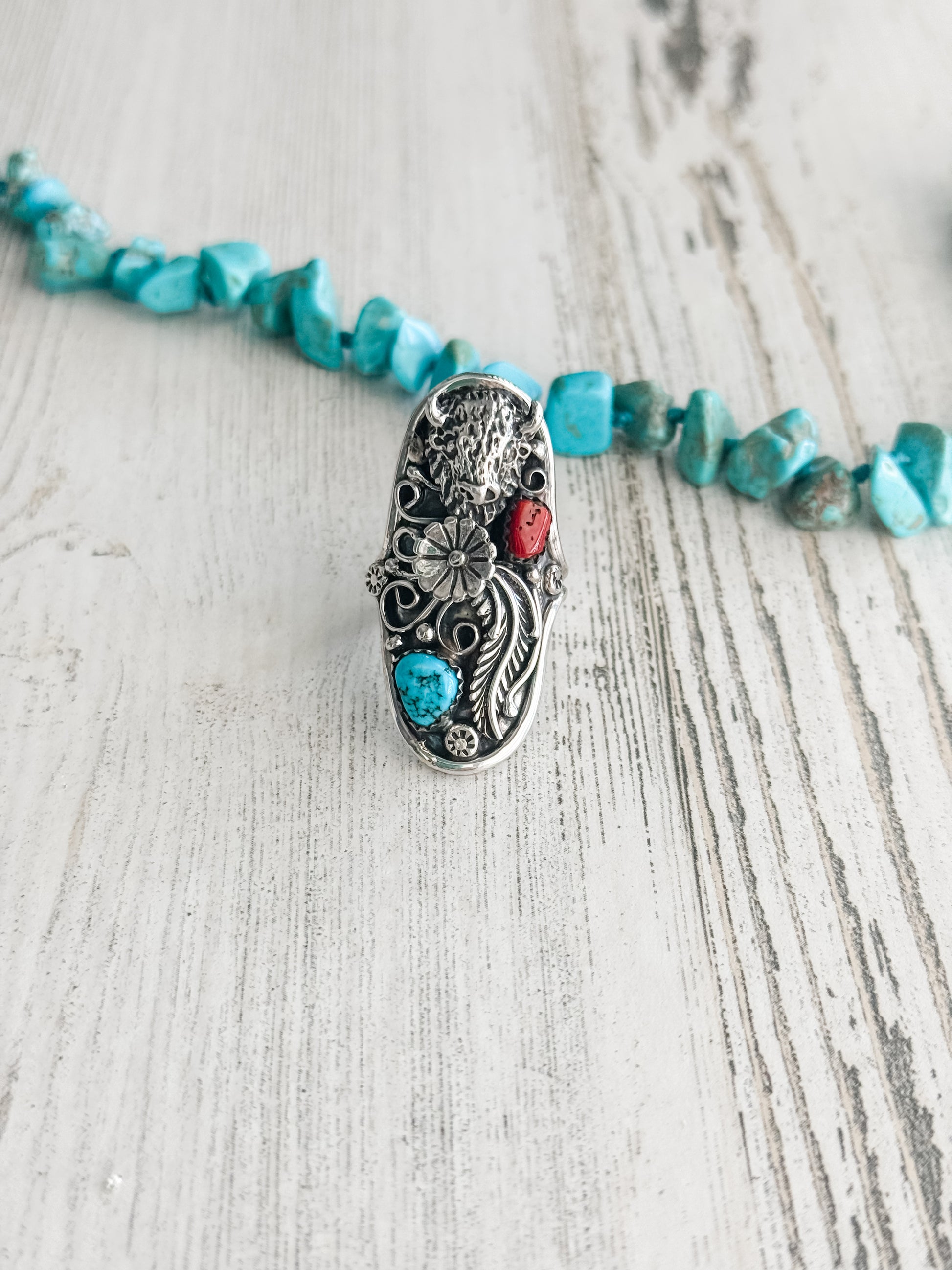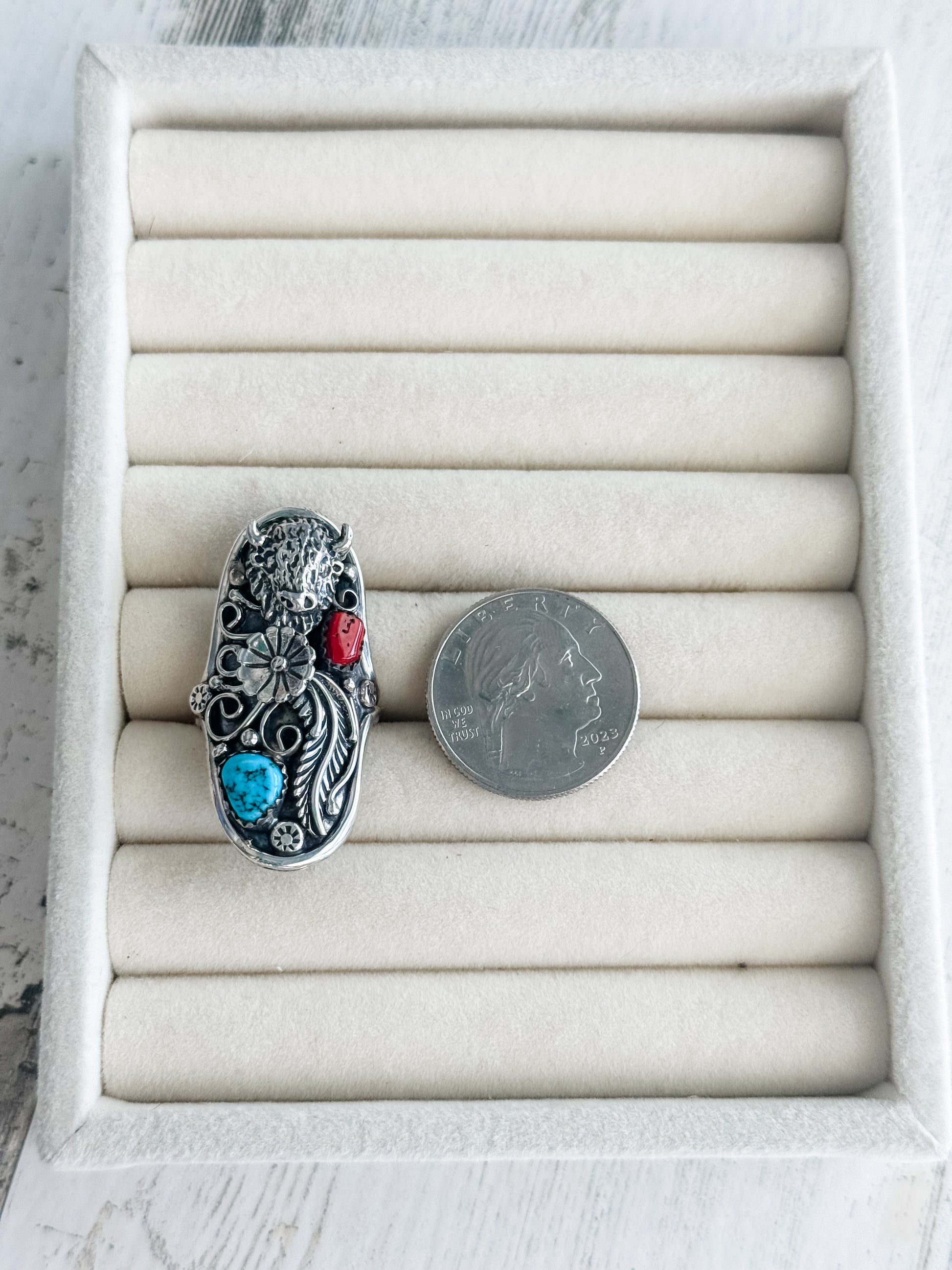 Native American Saddle Coral & Turquoise Buffalo Ring 8