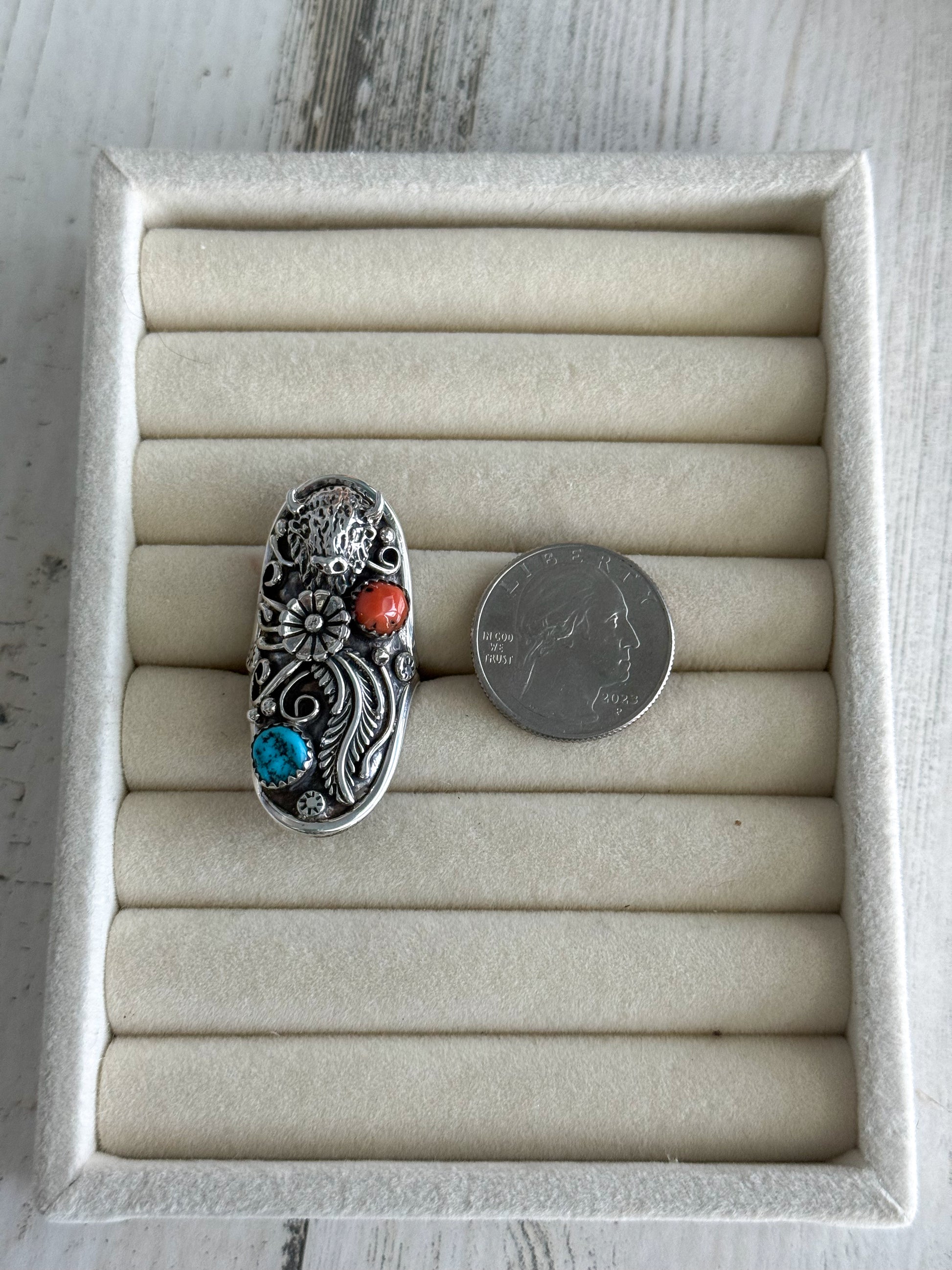 Native American Saddle Coral & Turquoise Buffalo Ring 8.5