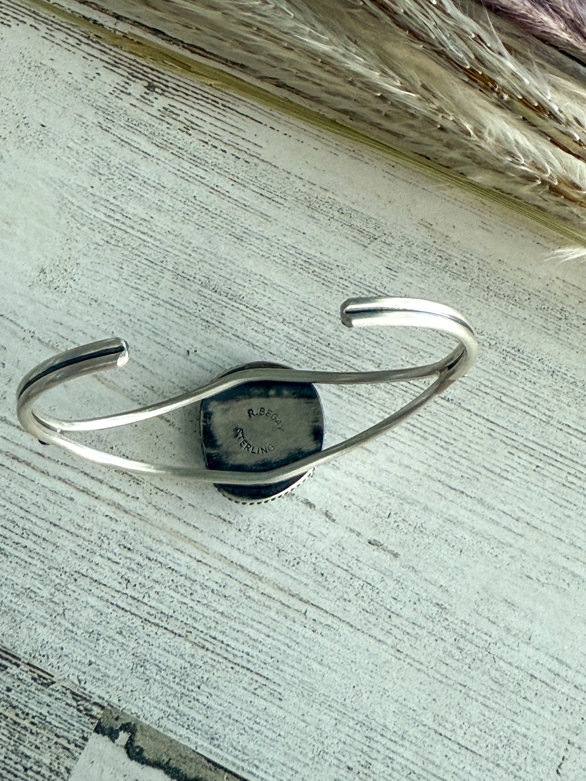 This handcrafted Native American cuff features a beautiful Sonoran Gem Turquoise center stone, known for its vibrant color and natural character. Created by Navajo artist Rena Begay, this piece reflects traditional Southwestern silversmithing with a timeless, wearable design.