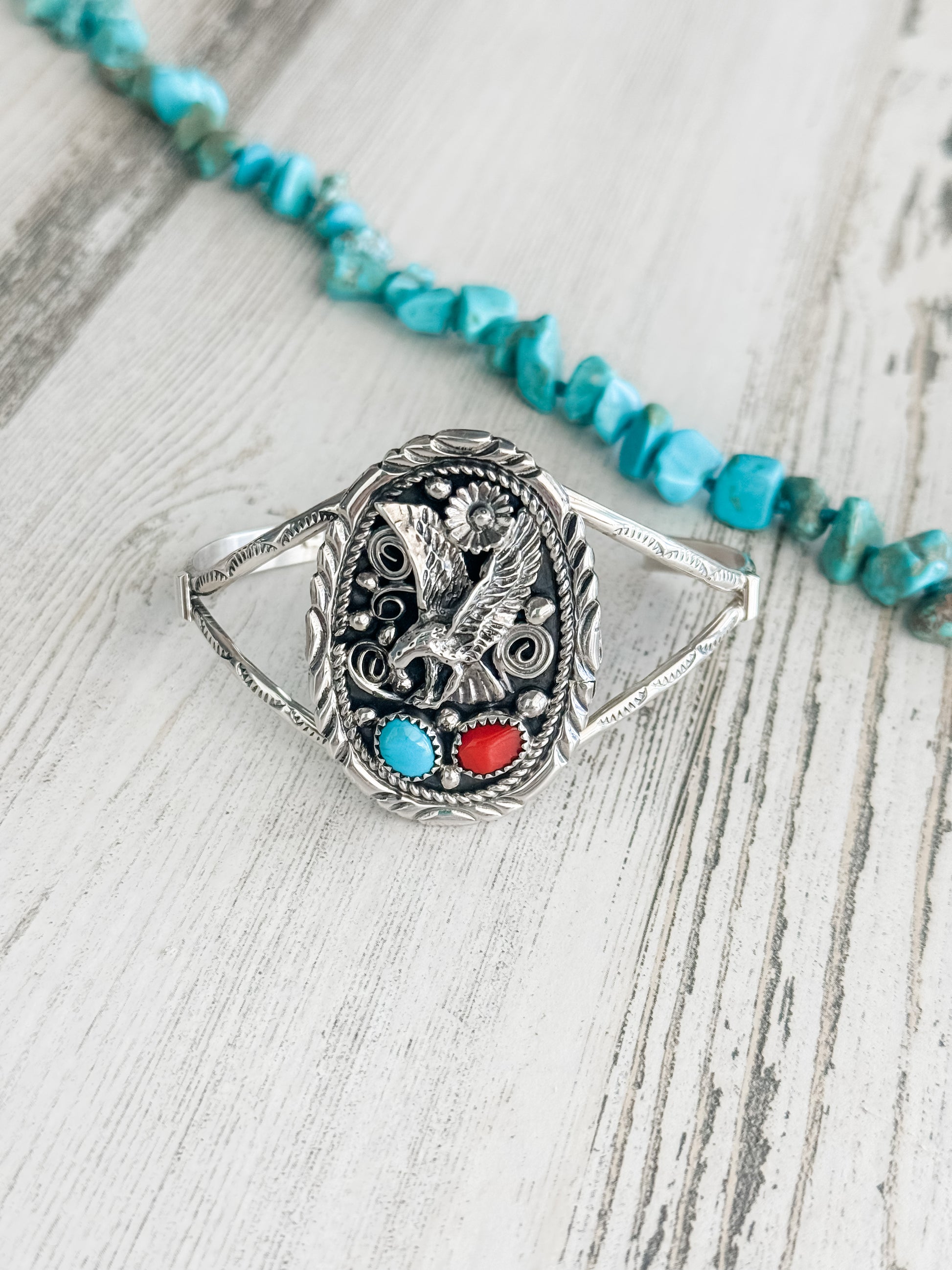 Celebrate Native American craftsmanship with this Turquoise & Coral Eagle Cuff by Navajo artist David Morris. The bracelet features a beautifully detailed silver eagle design, accented with one turquoise stone and one coral stone, blending bold color and symbolic artistry.