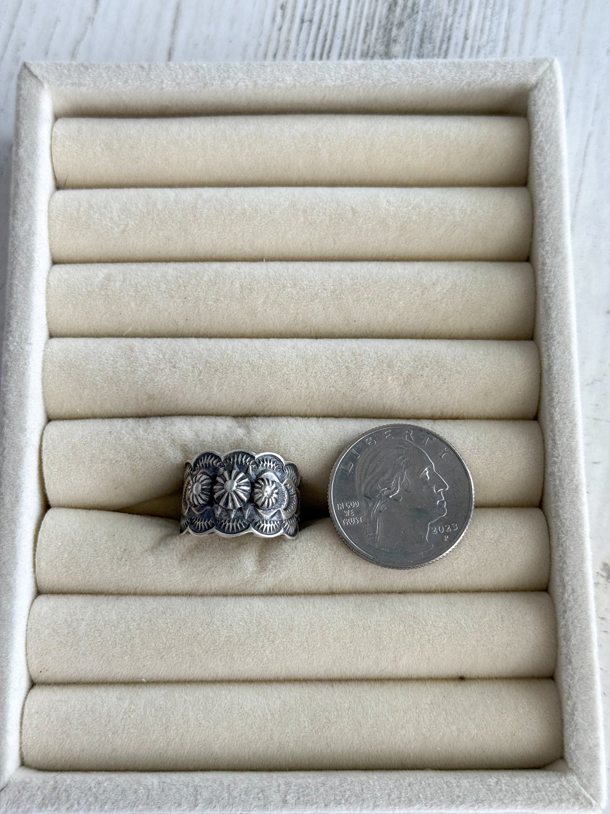 Crafted with a thick band for a bold presence, this ring features hand-stamped traditional patterns, highlighting the artistry and heritage of Navajo jewelry design. Made from solid sterling silver, it is polished to bring out the intricate details.