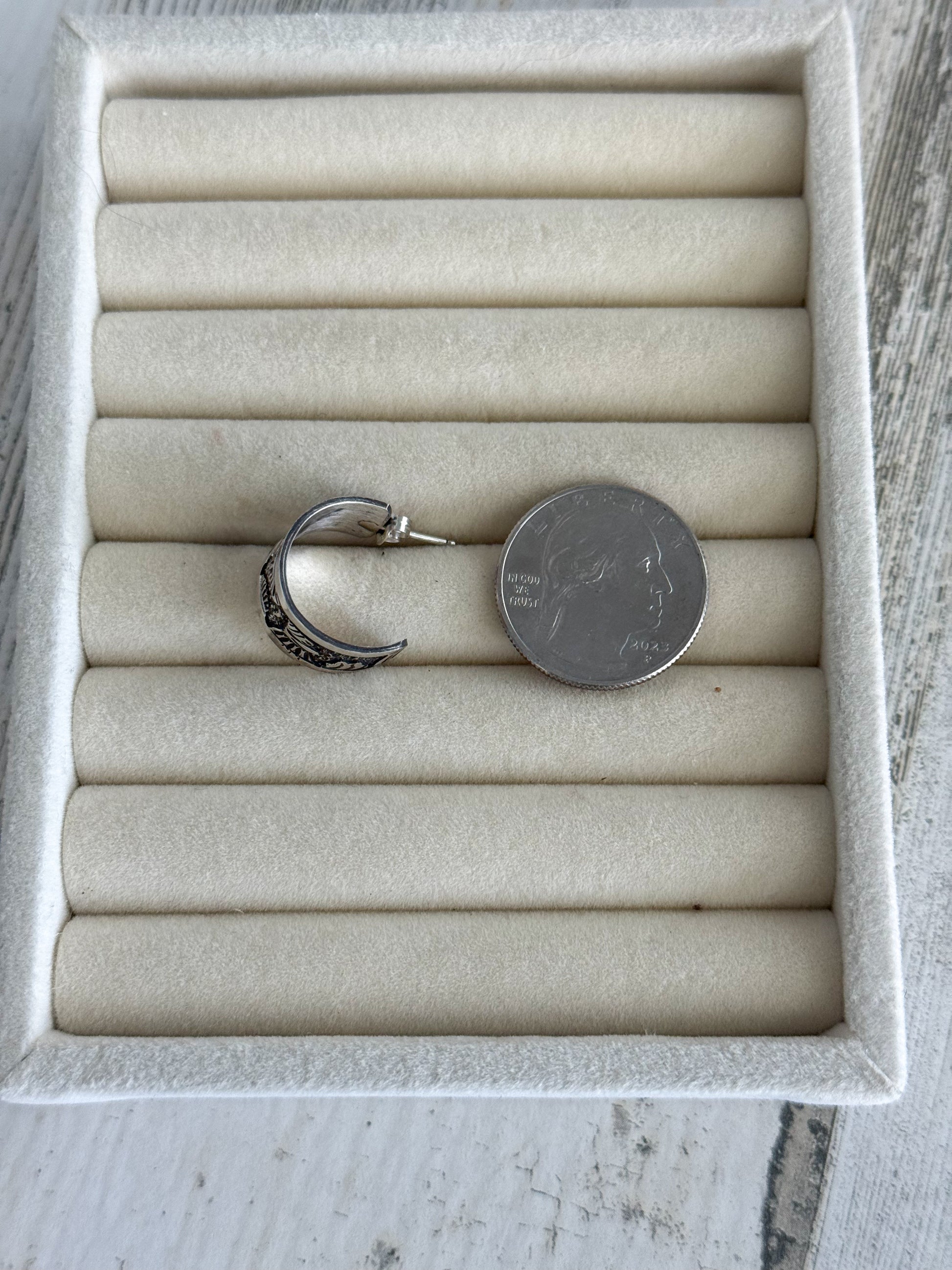 These hoops are meticulously crafted in sterling silver, showcasing intricate detailing that reflects the rich tradition of Native American oral history. The design is symbolic of the way stories are passed down through generations, making each pair a unique expression of Navajo culture and heritage.