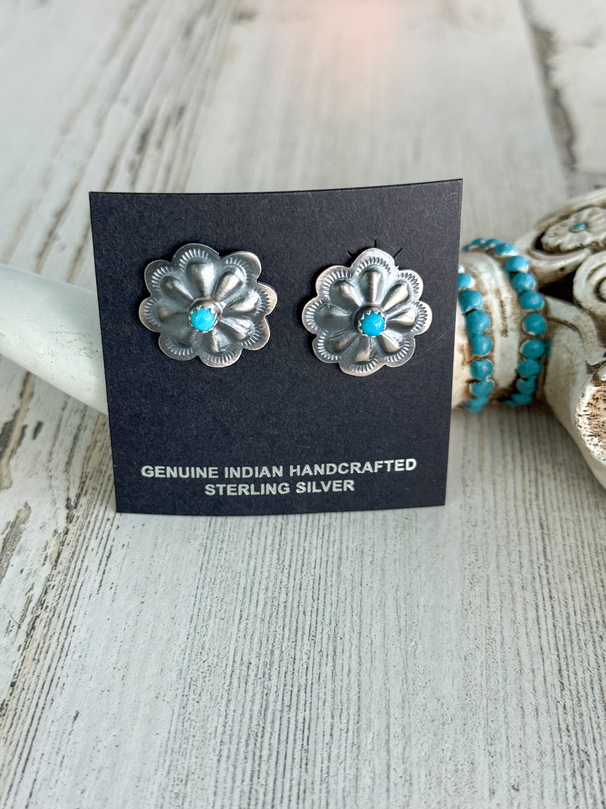 These Sterling Silver Concho Earrings by Navajo artist Dale Morgan are a timeless tribute to traditional Native American silversmithing. Each earring features a beautifully stamped concho design with a 4mm turquoise stone set at the center—adding a touch of natural color and cultural significance.