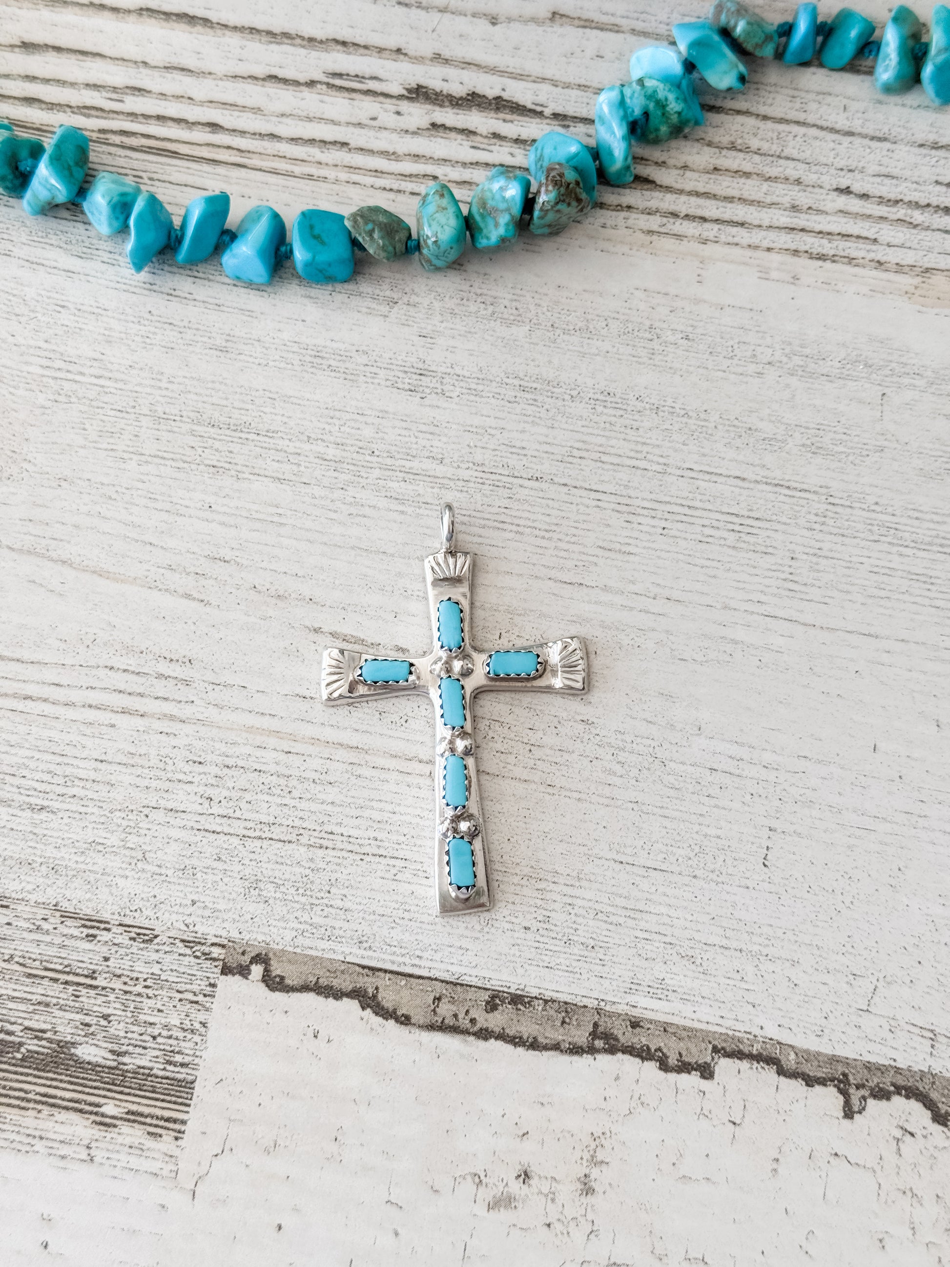 This handcrafted cross pendant by Zuni artist Verona Quam beautifully combines traditional Zuni design with vibrant turquoise. Featuring six genuine turquoise stones set in sterling silver, this pendant is a meaningful and striking piece of Native American jewelry.