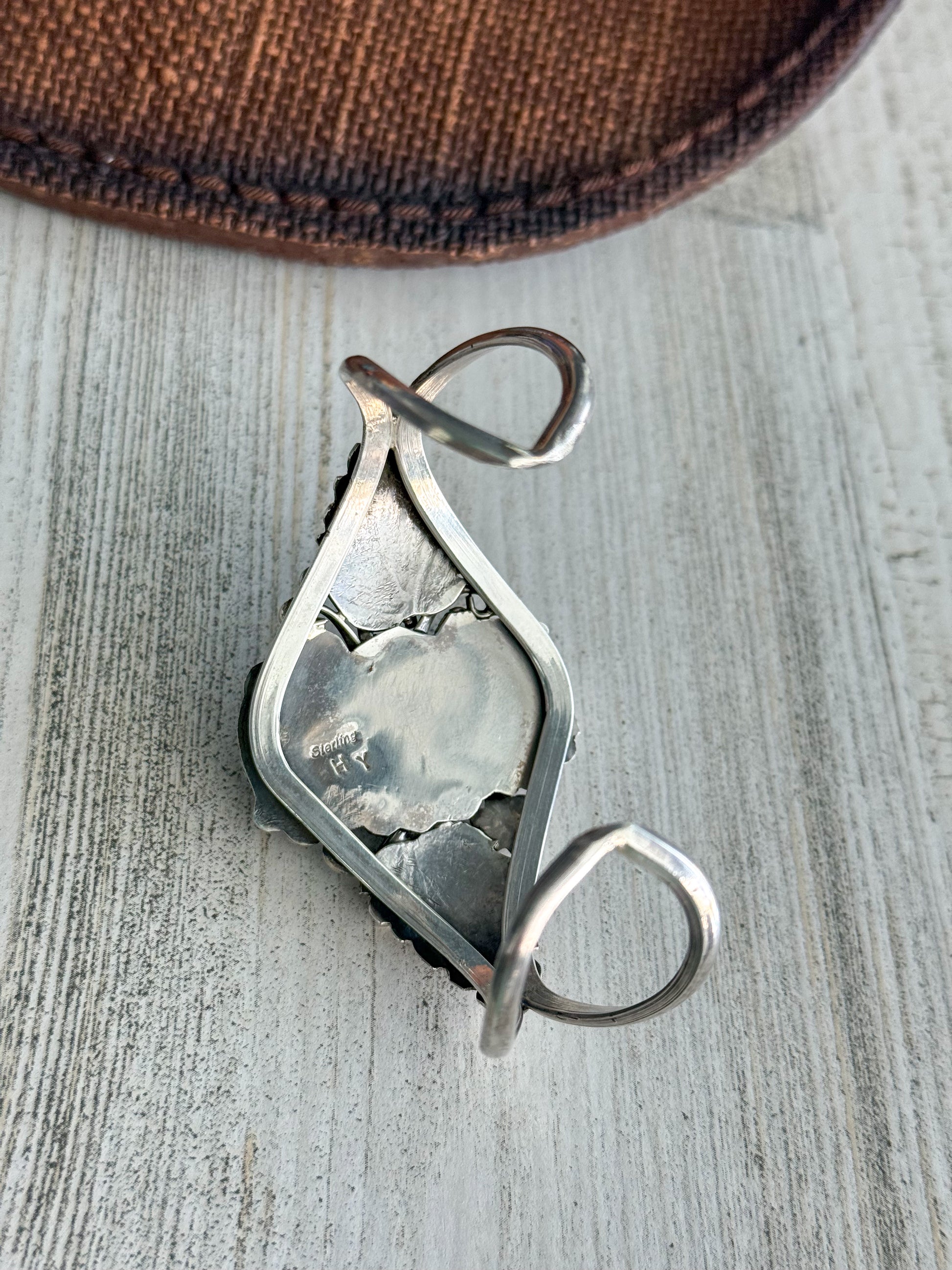 This handmade cuff features turquoise stones, accented by delicate sterling silver leaf details that highlight the artist’s skill and attention to detail. Measuring 5-1/2" in length with a 1-1/4" gap, it offers a comfortable, adjustable fit for most wrists.