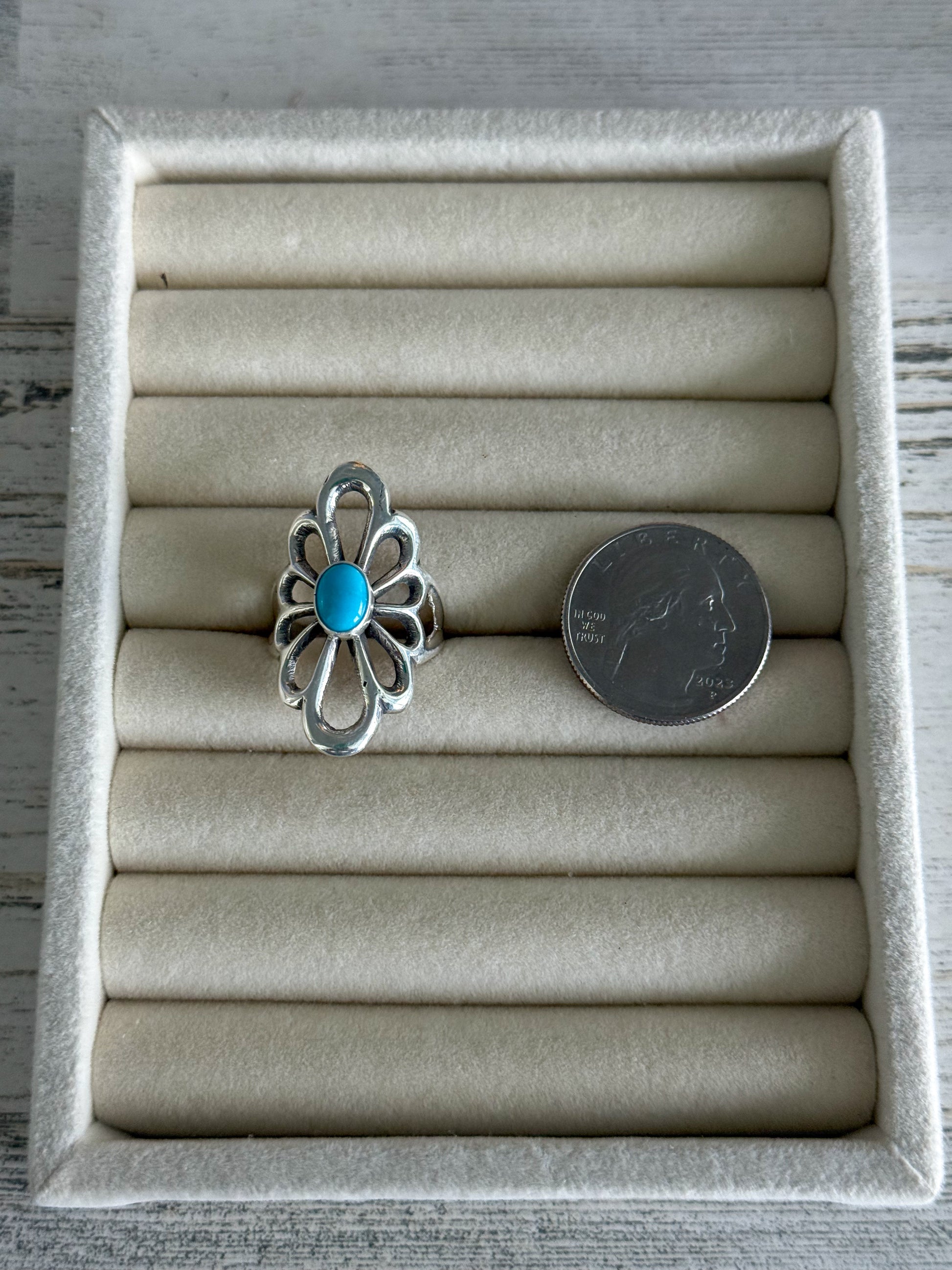 The ring features a genuine turquoise stone set in a detailed sterling silver cast design, creating a bold and timeless statement. Sized 8, it is perfect for collectors or anyone seeking authentic Native American jewelry.