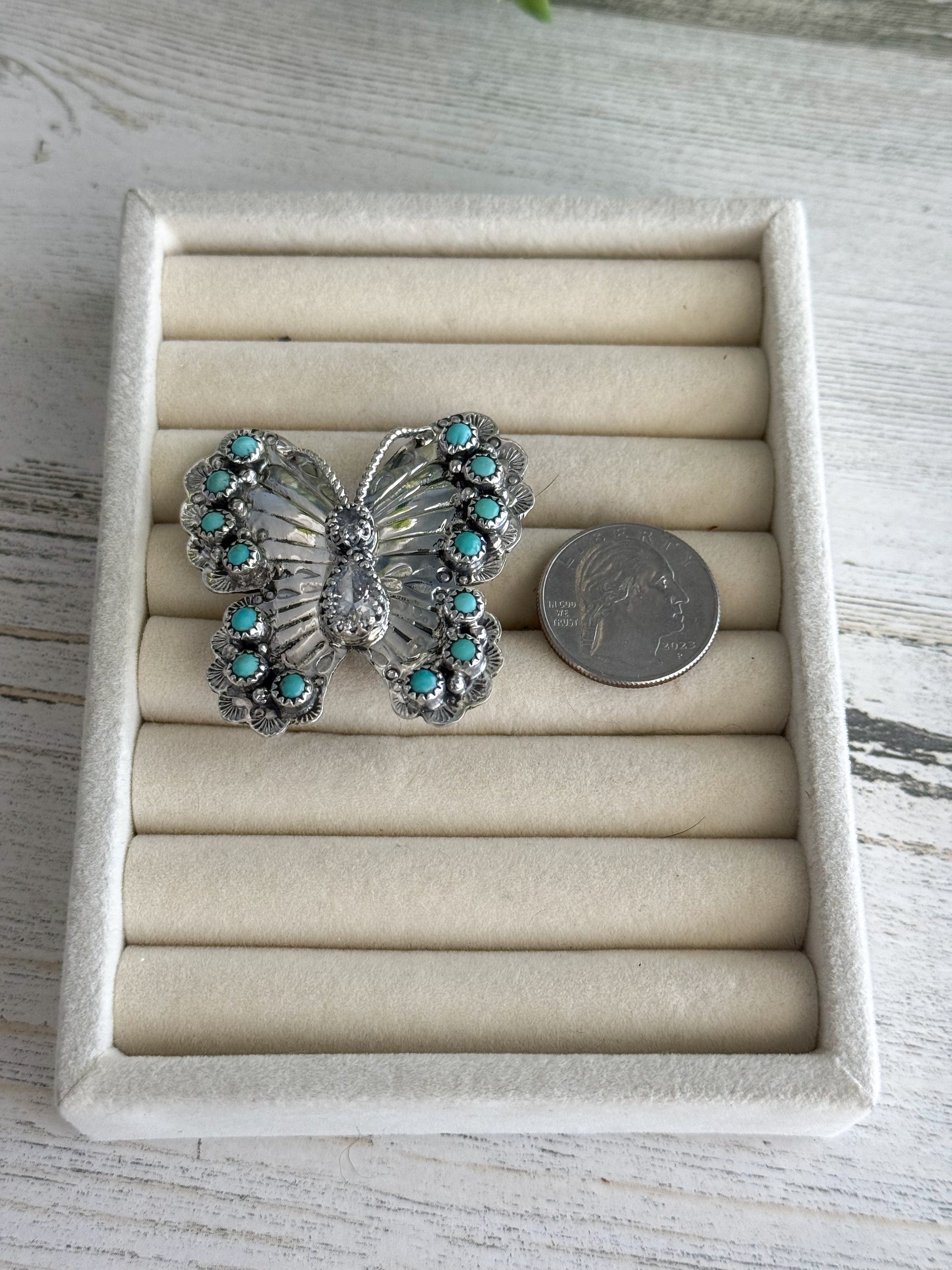 This stunning Native American butterfly ring is handcrafted by renowned Navajo artist Nikki Yazzie and showcases the timeless beauty of natural turquoise. The bold butterfly design is composed of 14 vibrant turquoise stones, carefully set to create a striking statement piece that celebrates artistry, nature, and tradition.