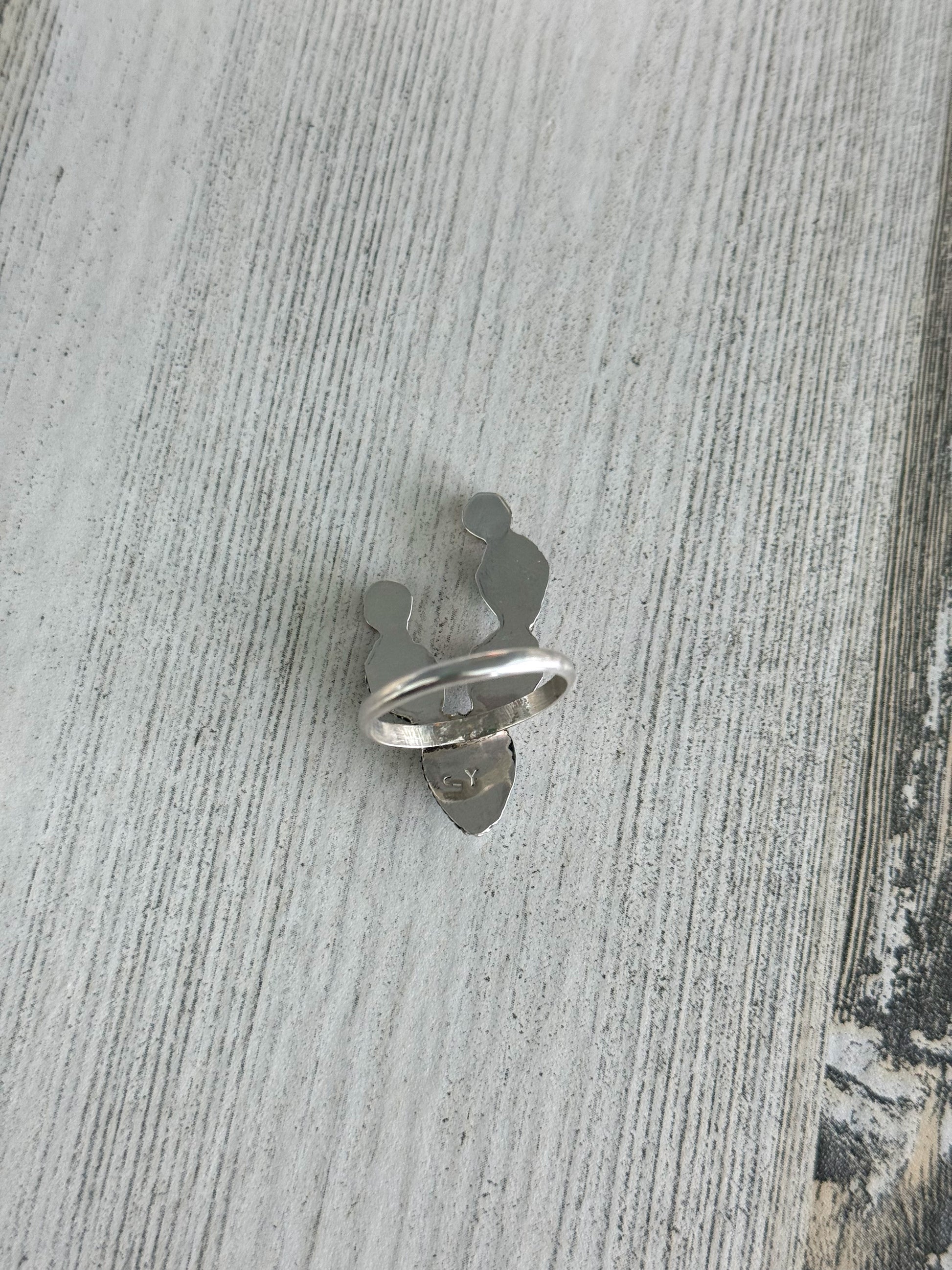 This handcrafted cactus-shaped ring by Navajo artist Jeanette Yazzie is a vibrant celebration of Southwestern design. Featuring genuine turquoise and coral accents, this sterling silver ring combines playful charm with authentic Navajo artistry.