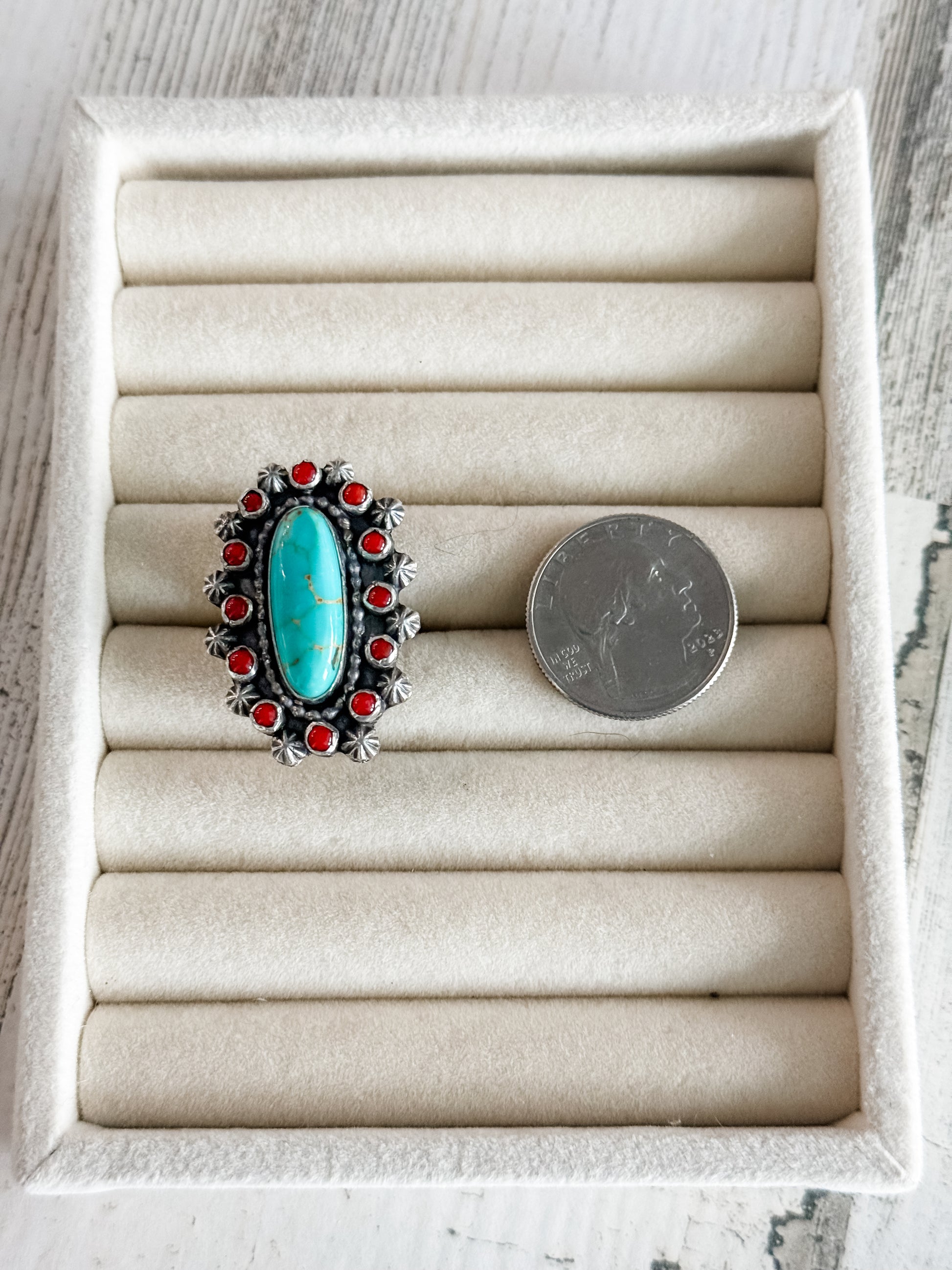 Showcase authentic Navajo artistry with this Sterling Silver Turquoise & Coral Ring, handcrafted by Navajo artist Adrian Yazzie. Featuring a large central turquoise stone surrounded by 12 smaller coral stones, this ring combines vibrant Southwestern colors with intricate silverwork, creating a bold and stunning statement piece.