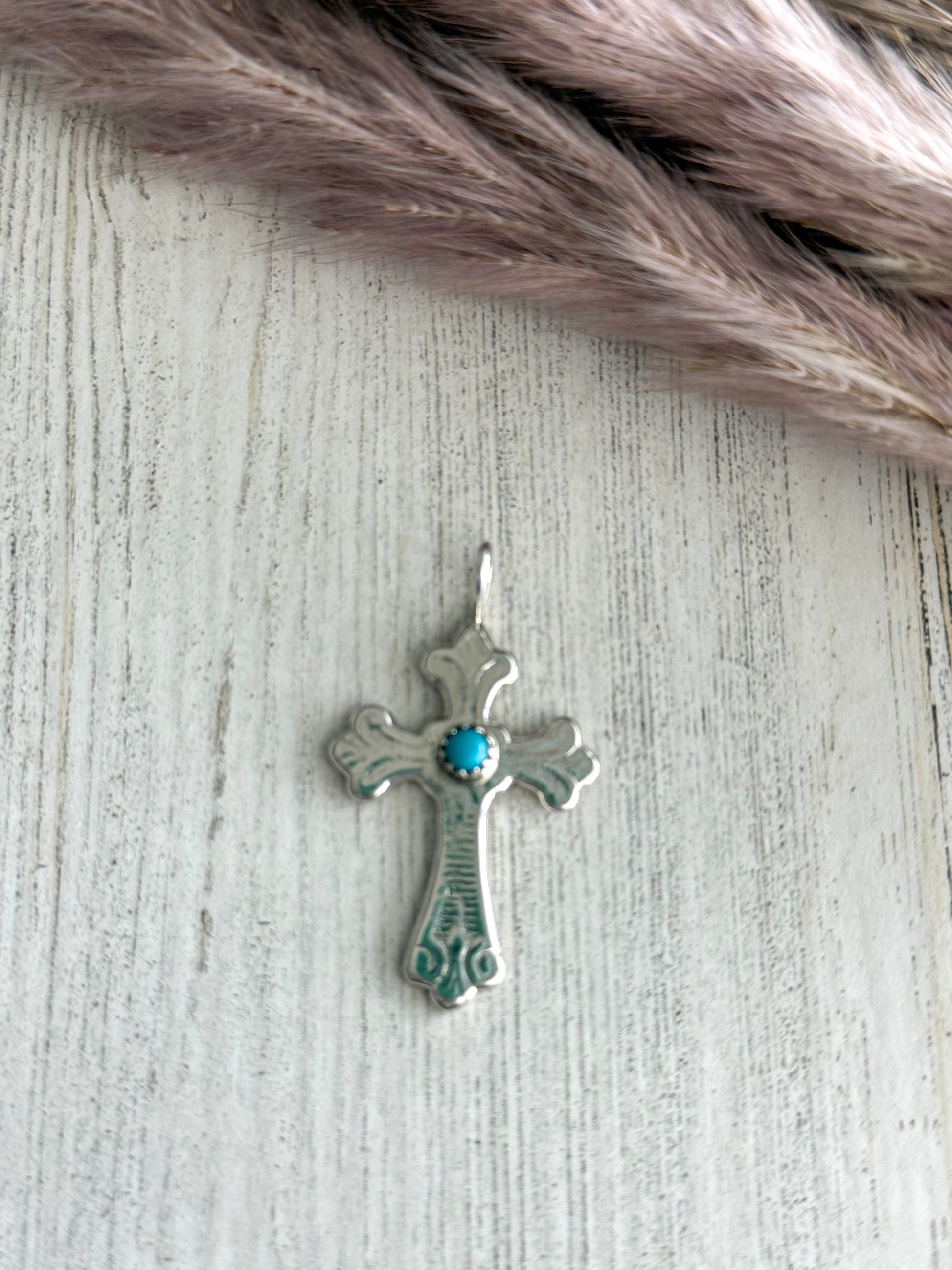 Handcrafted by Navajo artist Pauline Nelson, this elegant sterling silver cross pendant features a vibrant turquoise stone at its center, highlighting the natural beauty and classic style of Southwestern jewelry. The pendant reflects traditional Navajo craftsmanship, combining symbolic design with artistic detail.