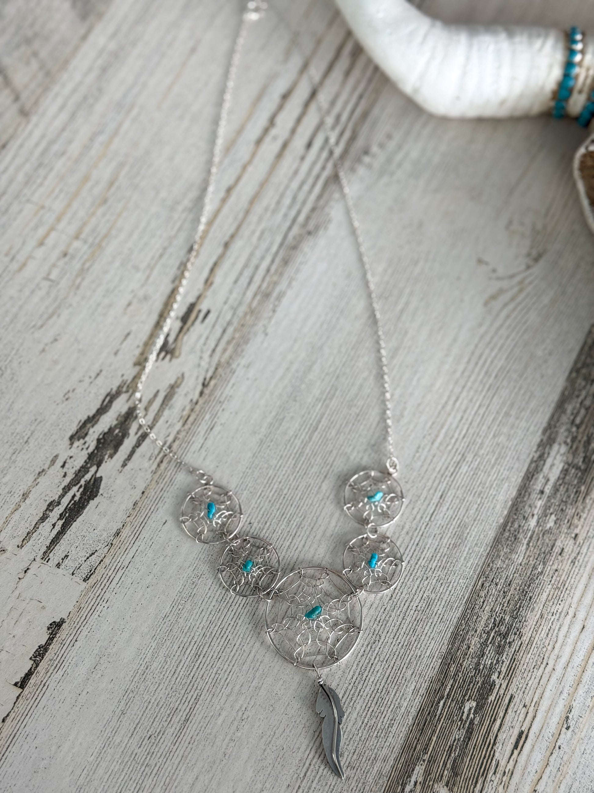 This handcrafted dreamcatcher necklace by Navajo artist Lorenzo Arviso features a turquoise accent and is suspended on an 18" chain, making it a versatile and eye-catching accessory. The intricate dreamcatcher design symbolizes protection and positive energy, reflecting traditional Native American artistry.