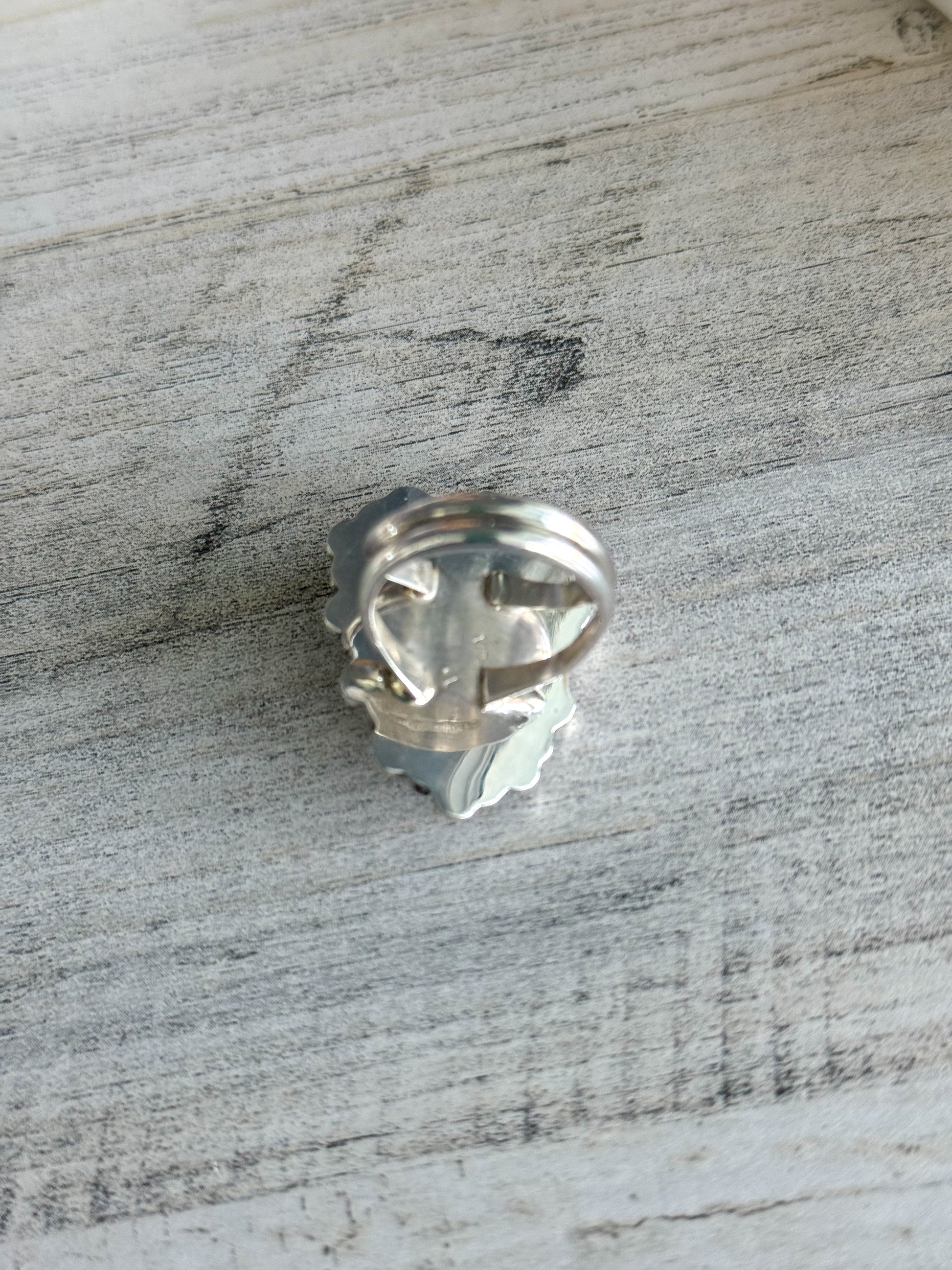The ring features a genuine turquoise stone accented with beautiful sterling silver detailing, highlighting the artistry and skill of Navajo silversmithing. Sized 8, it makes a bold and elegant statement for any jewelry collection.