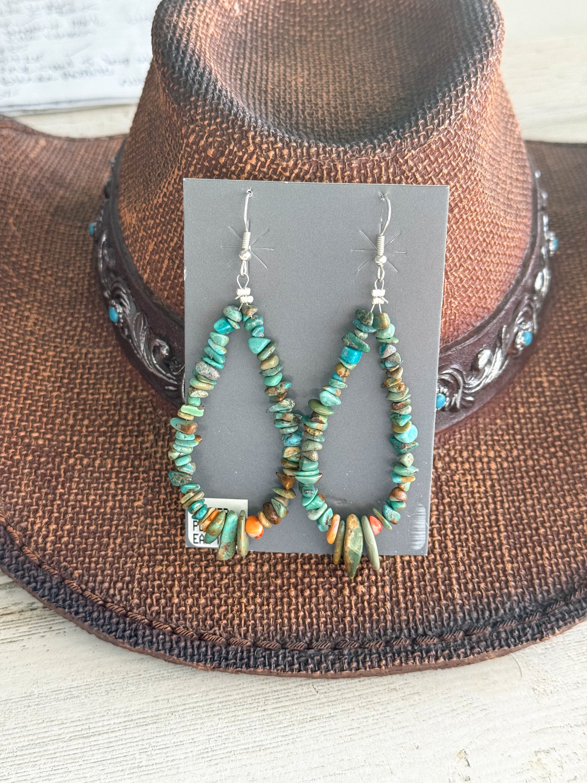 These beautiful handcrafted hoop earrings are made by Navajo artist Valarie Johnson, featuring a vibrant combination of natural turquoise nuggets accented with two orange spiny oyster nuggets. The blend of blue and orange creates a warm, earthy contrast that highlights the beauty of both stones.