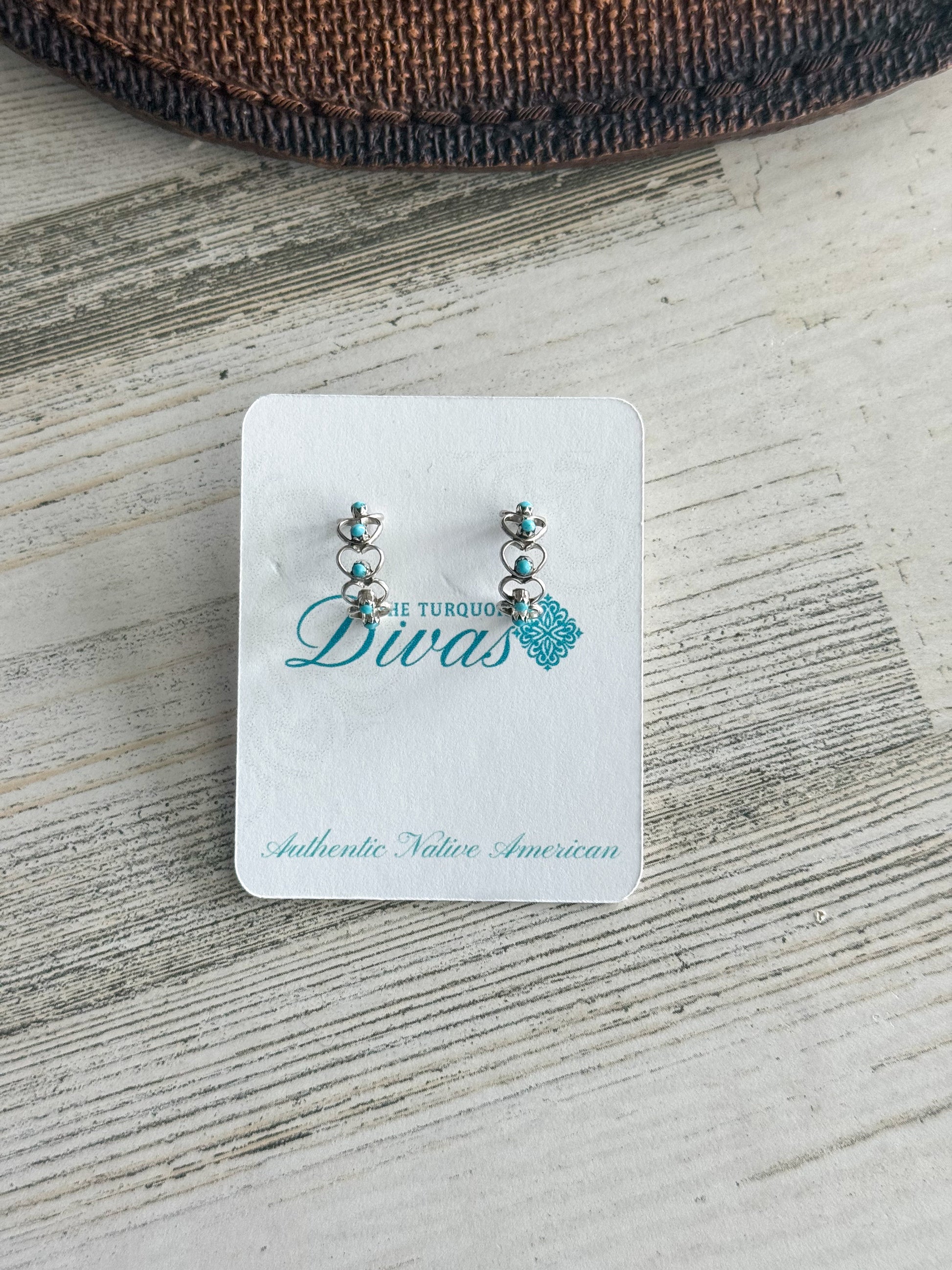 These charming sterling silver hoop earrings are inspired by traditional Zuni jewelry design, showcasing delicate craftsmanship and colorful turquoise accents. Each hoop features five mini wire hearts, each set with a small dot of turquoise, creating a playful yet elegant design.