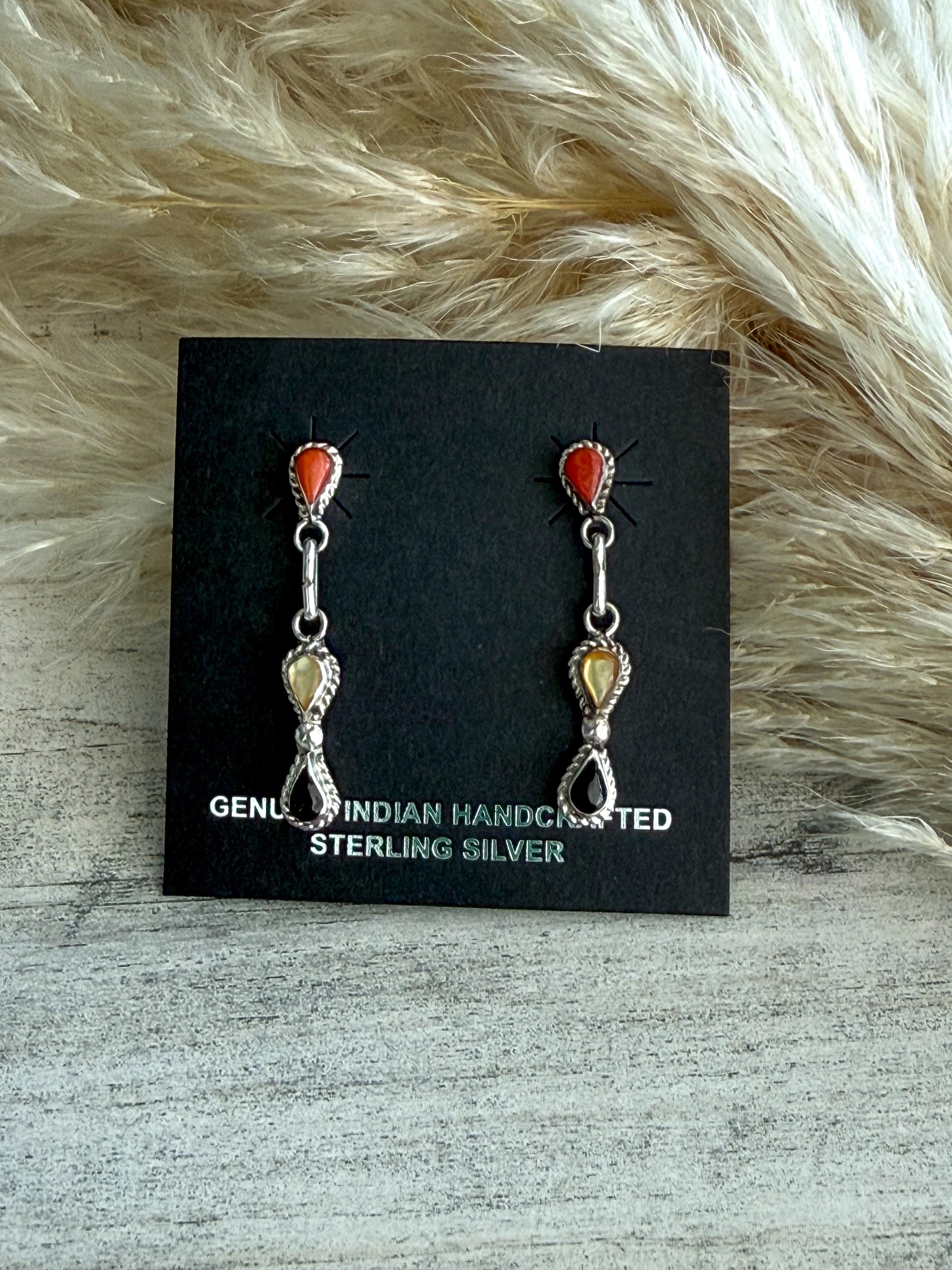 These handcrafted Native American Zuni dangle earrings showcase a beautiful combination of traditional materials, featuring a coral red stone, yellow shell stone, and black jet stone. The vibrant color contrast reflects classic Zuni artistry and timeless Southwestern design.