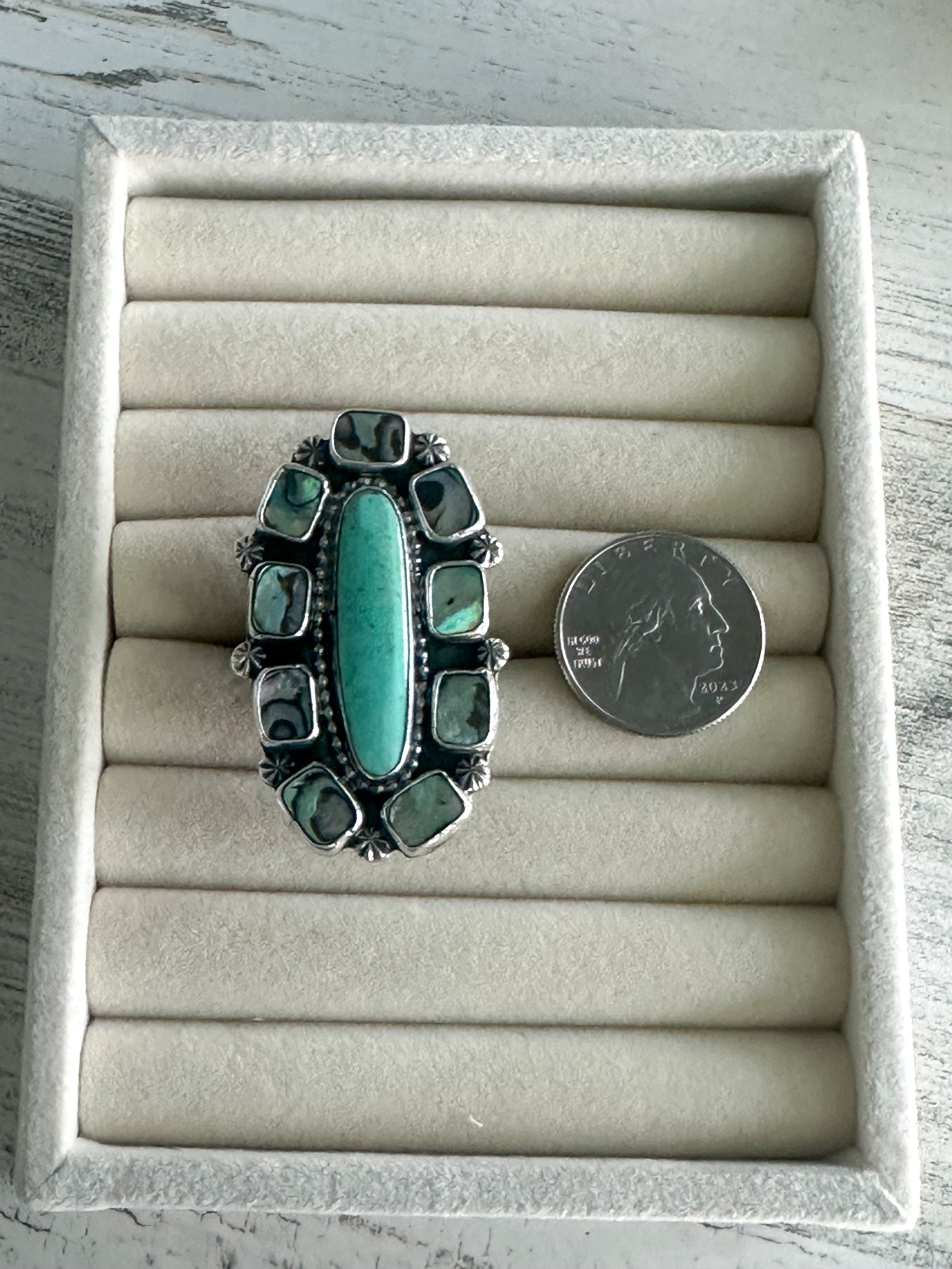 Make a bold statement with this large, adjustable turquoise and abalone ring, expertly crafted by Navajo artist Adrian Yazzie. The shimmering abalone shells catch the light beautifully, contrasting with the vibrant turquoise stones for a striking effect.