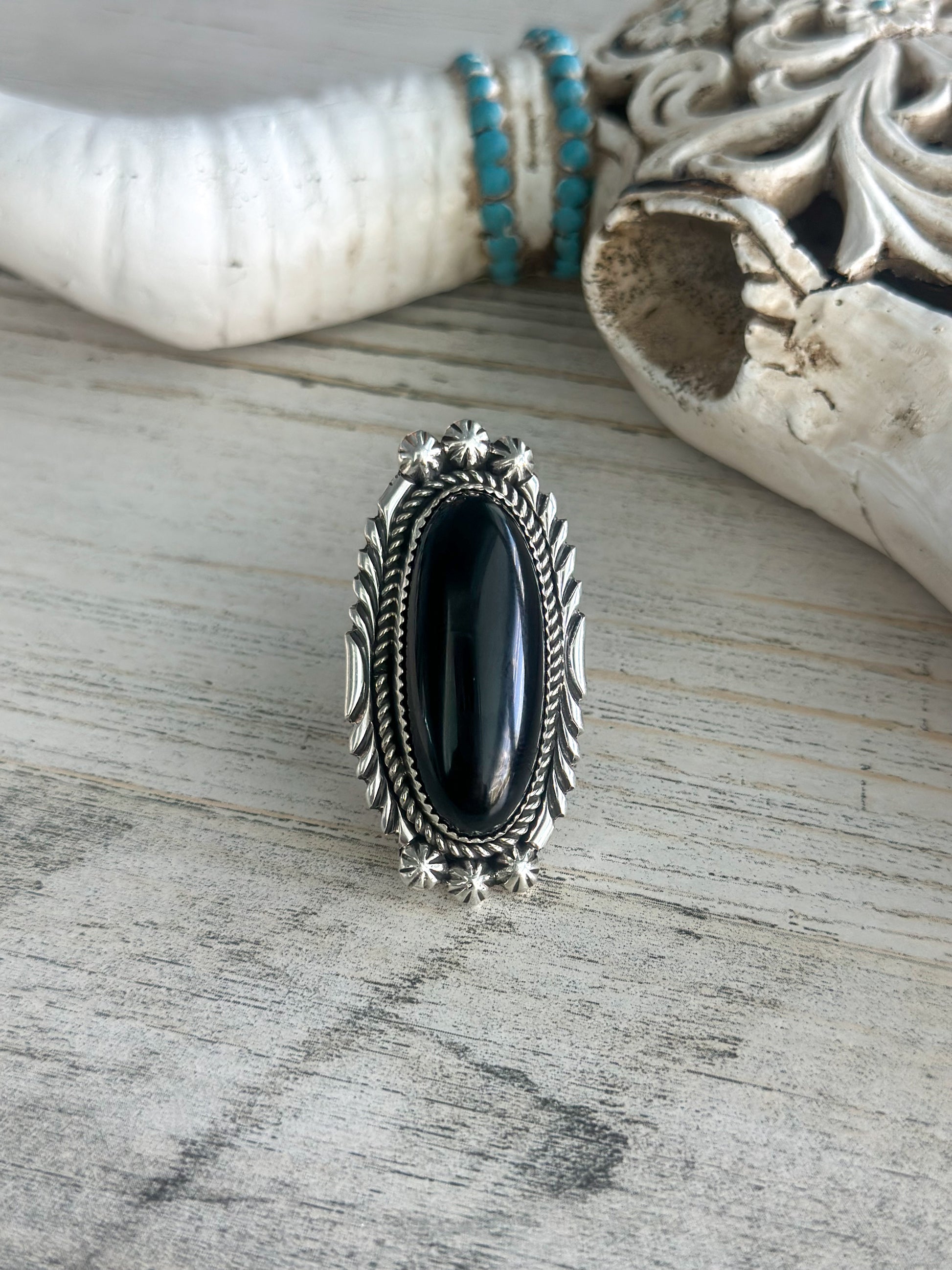 Make a bold statement with this exceptional handcrafted ring by renowned Navajo silversmith Albert Smith. Featuring a striking, oversized black onyx stone, this piece showcases the artistry and heritage of Native craftsmanship.