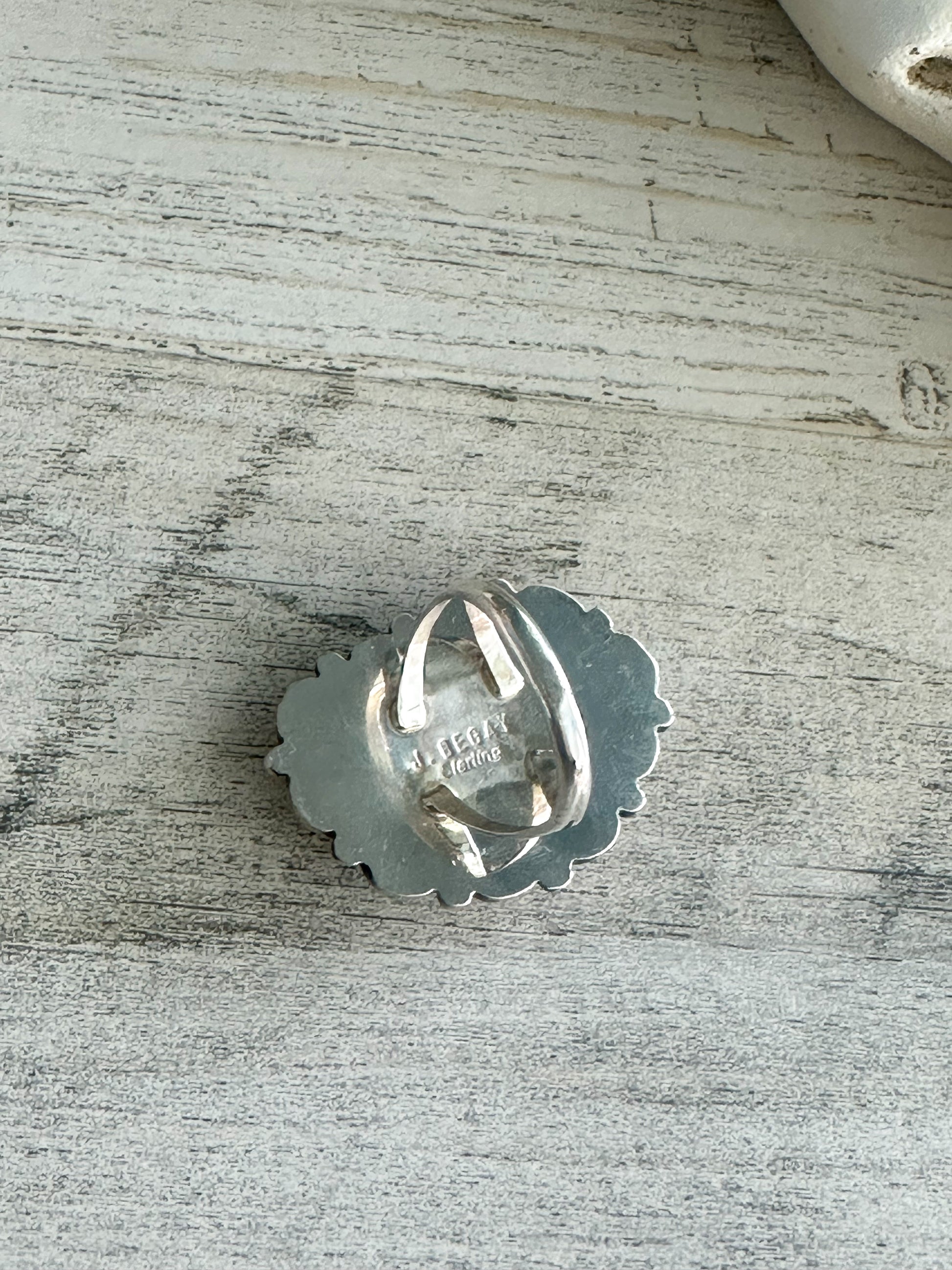 Experience the beauty of the Southwest with this authentic Navajo sterling silver ring featuring a unique Emerald Valley Turquoise stone. The stone is elegantly framed by intricate scalloped silver detailing, showcasing traditional Navajo craftsmanship.