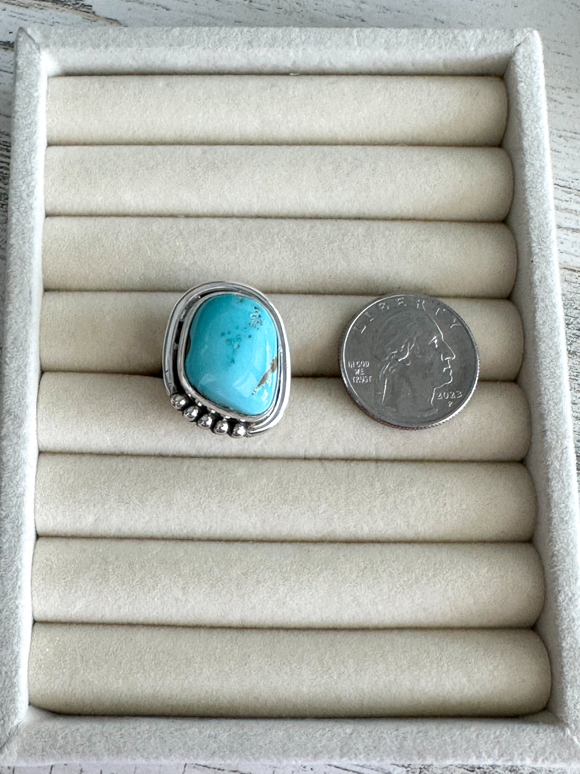 Rich with earthy beauty and traditional craftsmanship, this Blue Royston Turquoise Ring is handcrafted by Navajo artist Kree Blanchard. The Royston turquoise stone, known for its stunning blue hues and natural matrix, is set in sterling silver and finished with thoughtful detailing that highlights its organic charm.